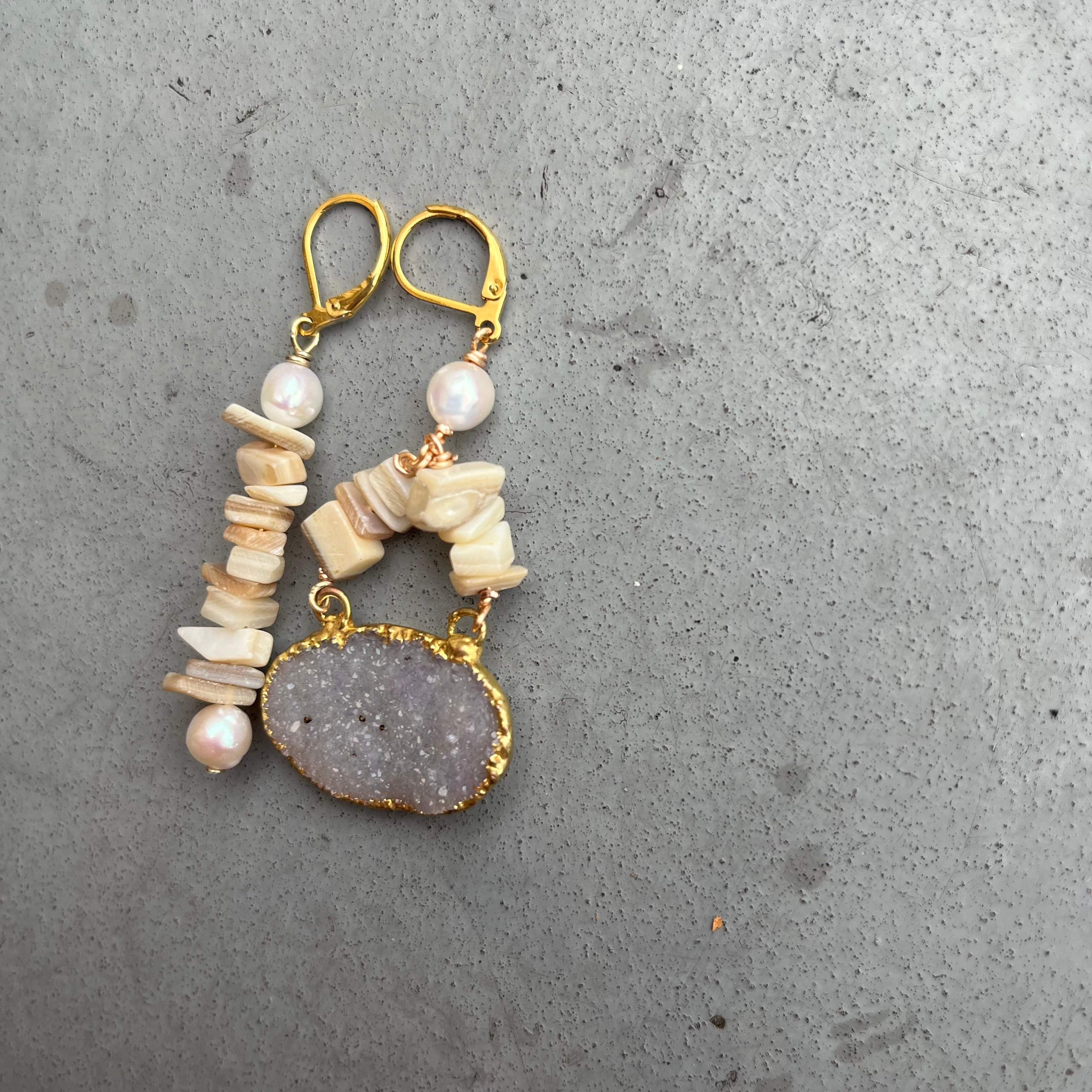 ドゥルージーとシェルとパールを使ったアシンメトリーなデザインピアス(イヤリング)