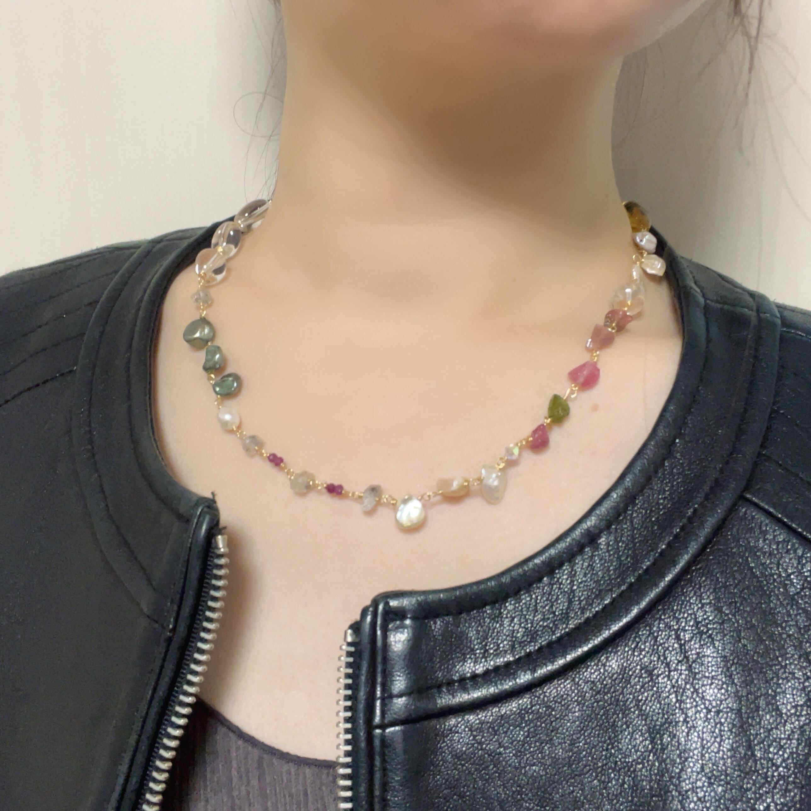 トルマリンや、ルビー、シトリン、淡水パール、水晶など、様々な素材を配置したショートネックレス。