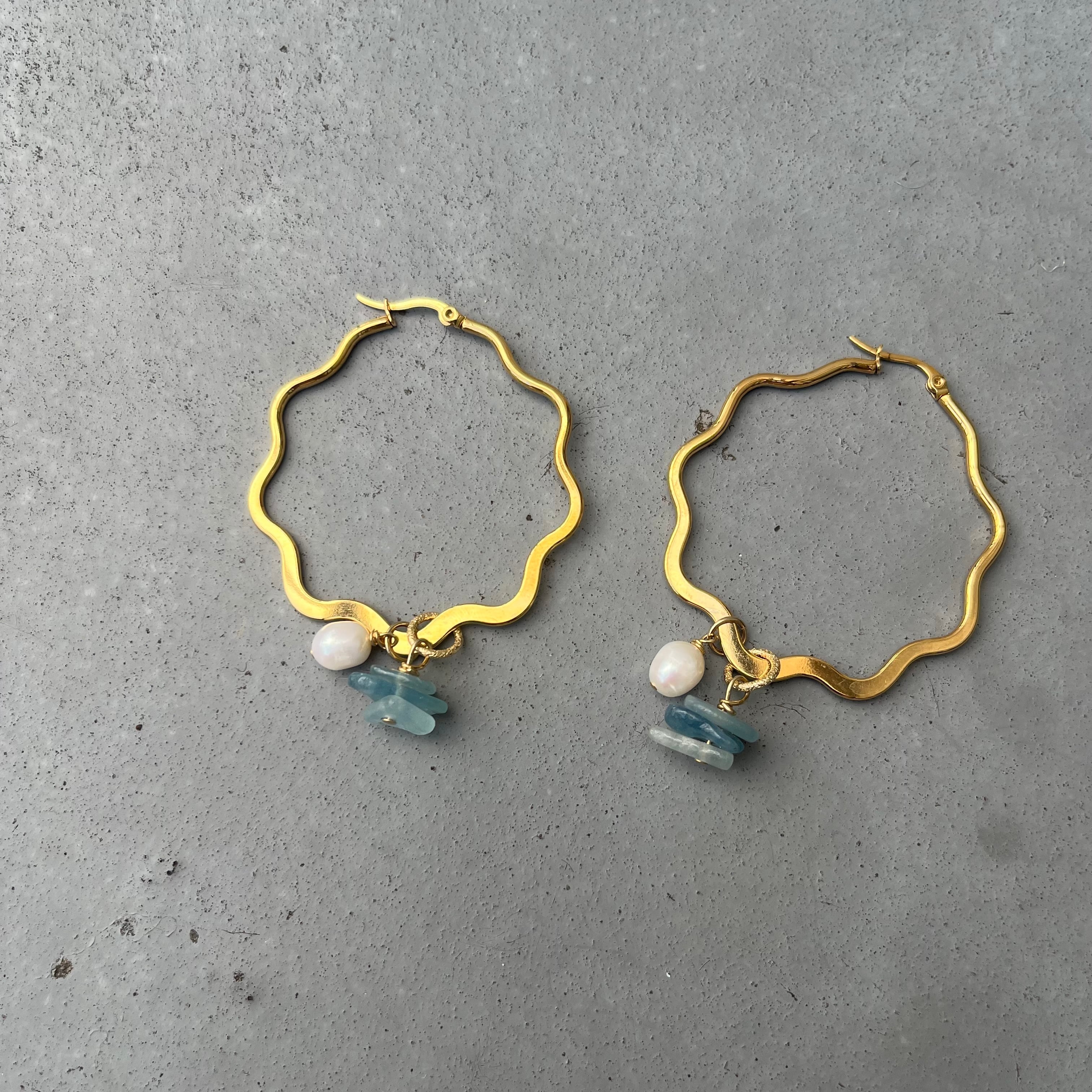 アクアマリンとパールのうねうねフープピアス