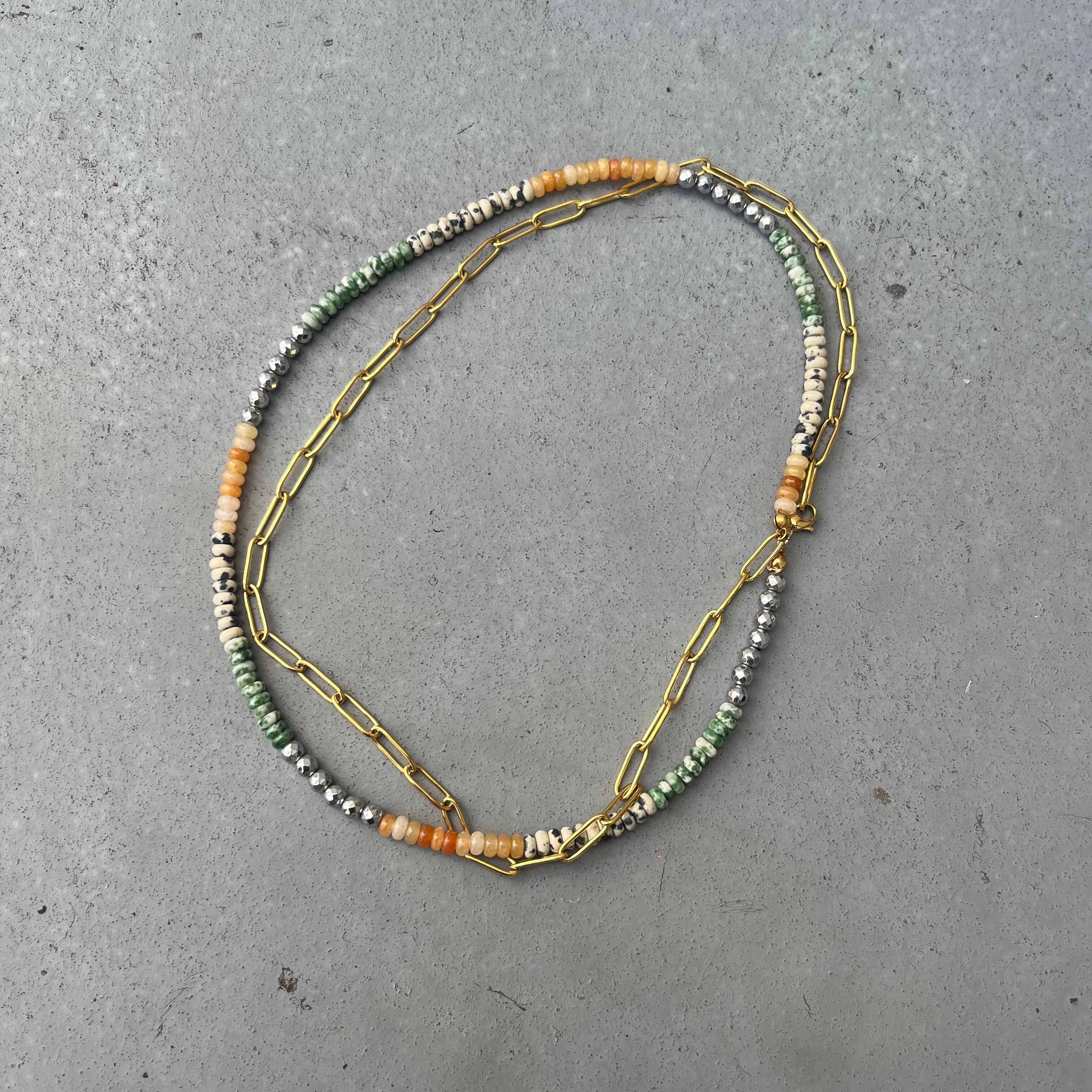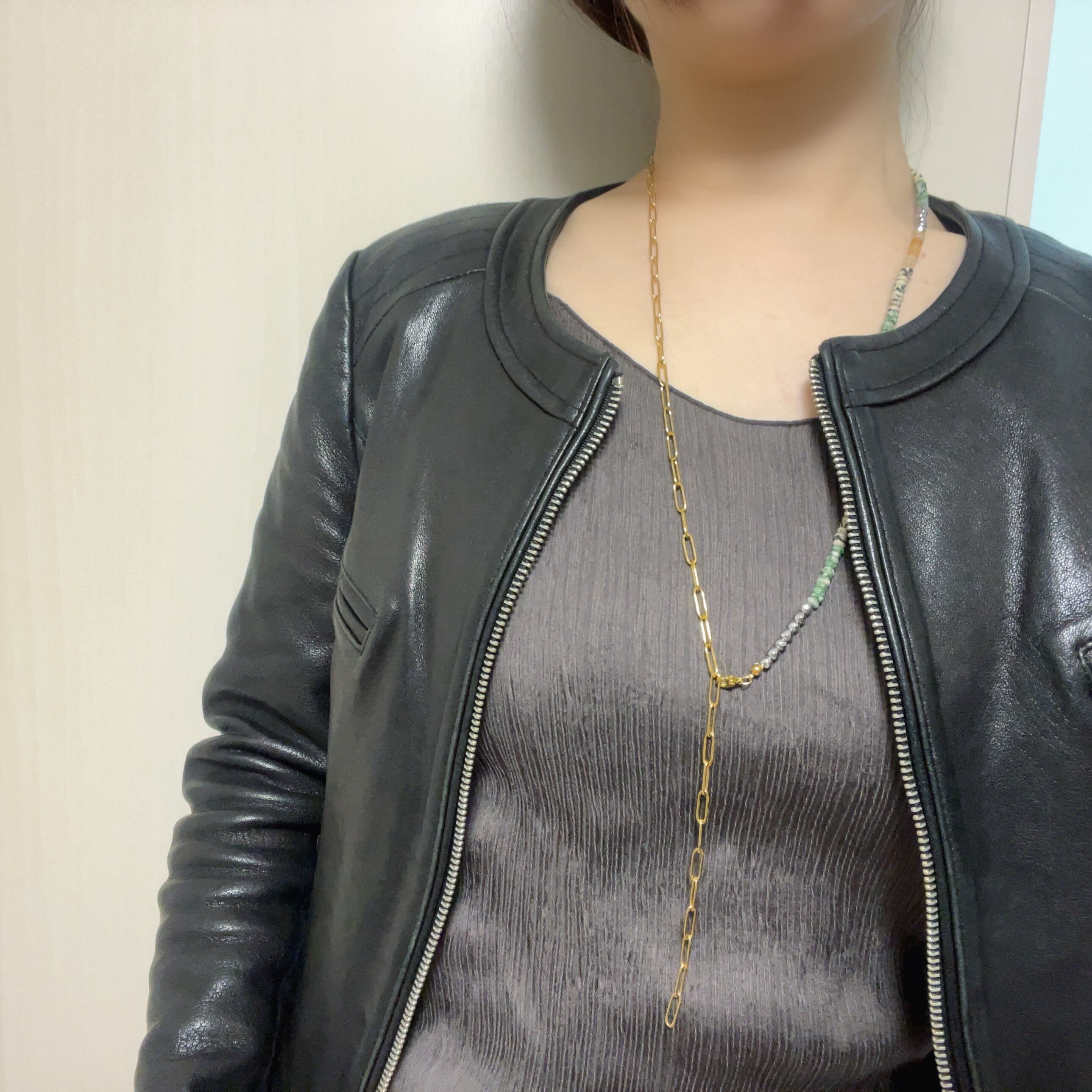 天然石をエキゾチックでクールに配色したネックレス。チェーン部分で長さ調整のできるデザイン。2重付けやY字使いなどにもアレンジできます。