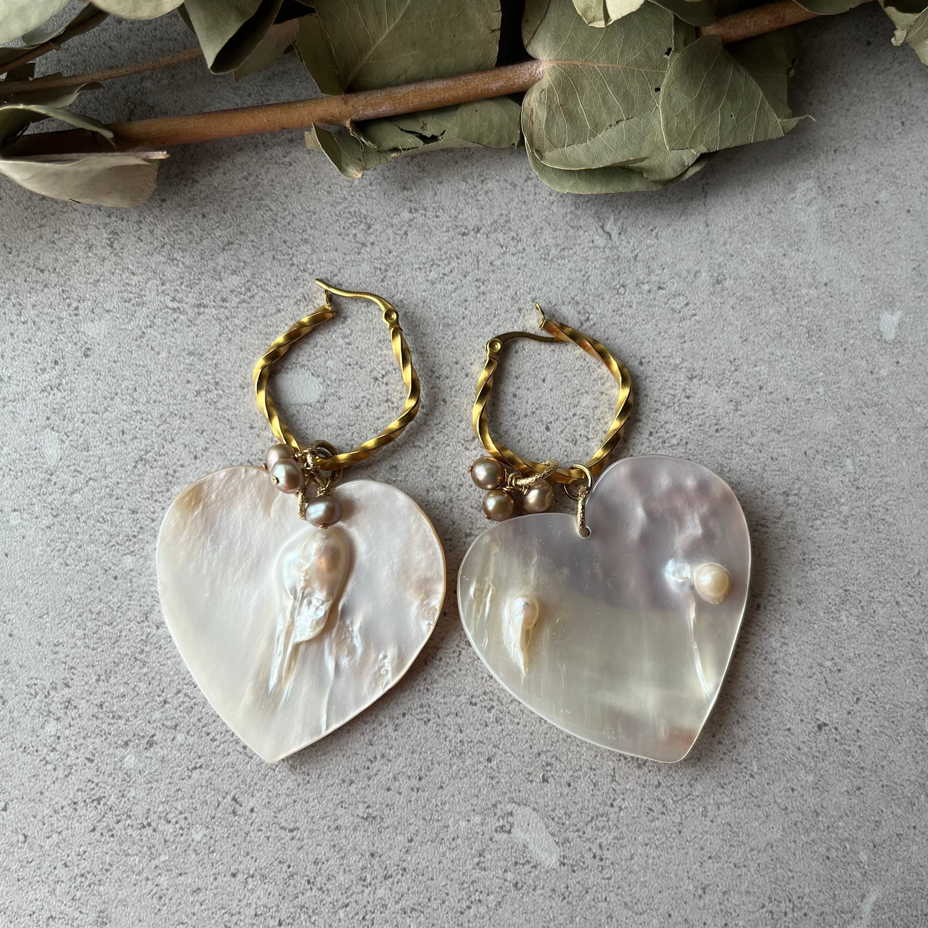貝殻の内側にくっついて育つ「ブリスターパール」を使ったハート型のシェルとフープのピアス。