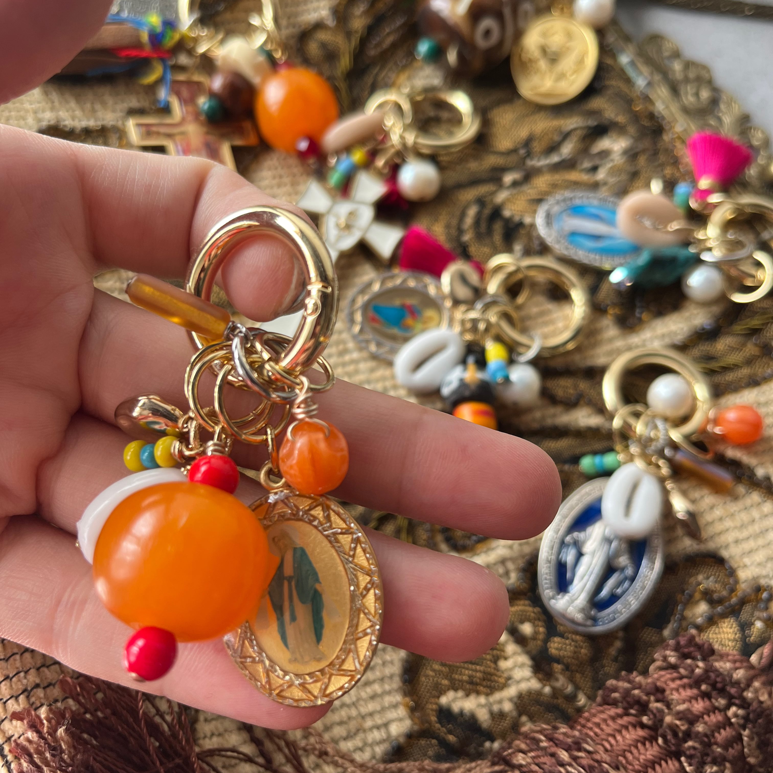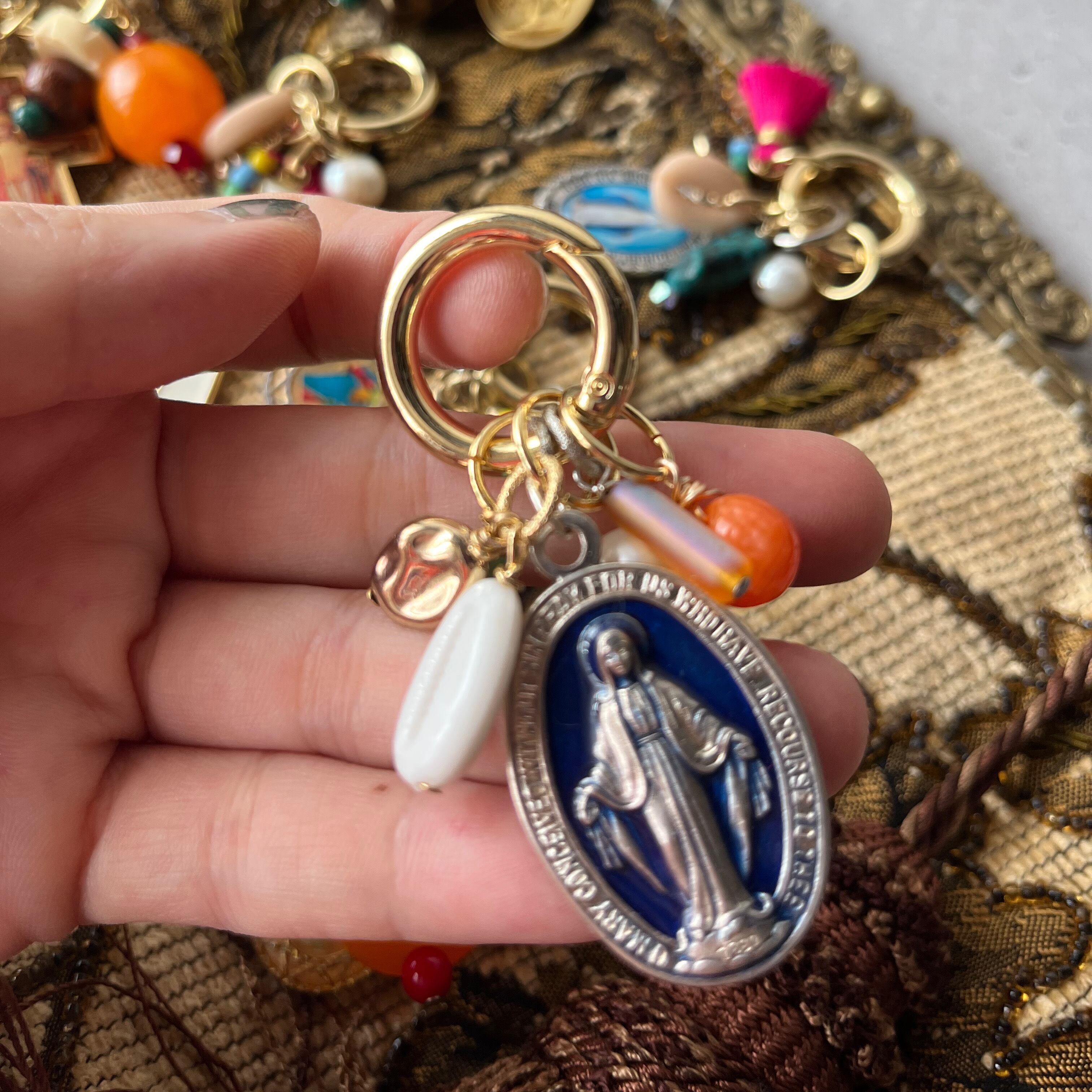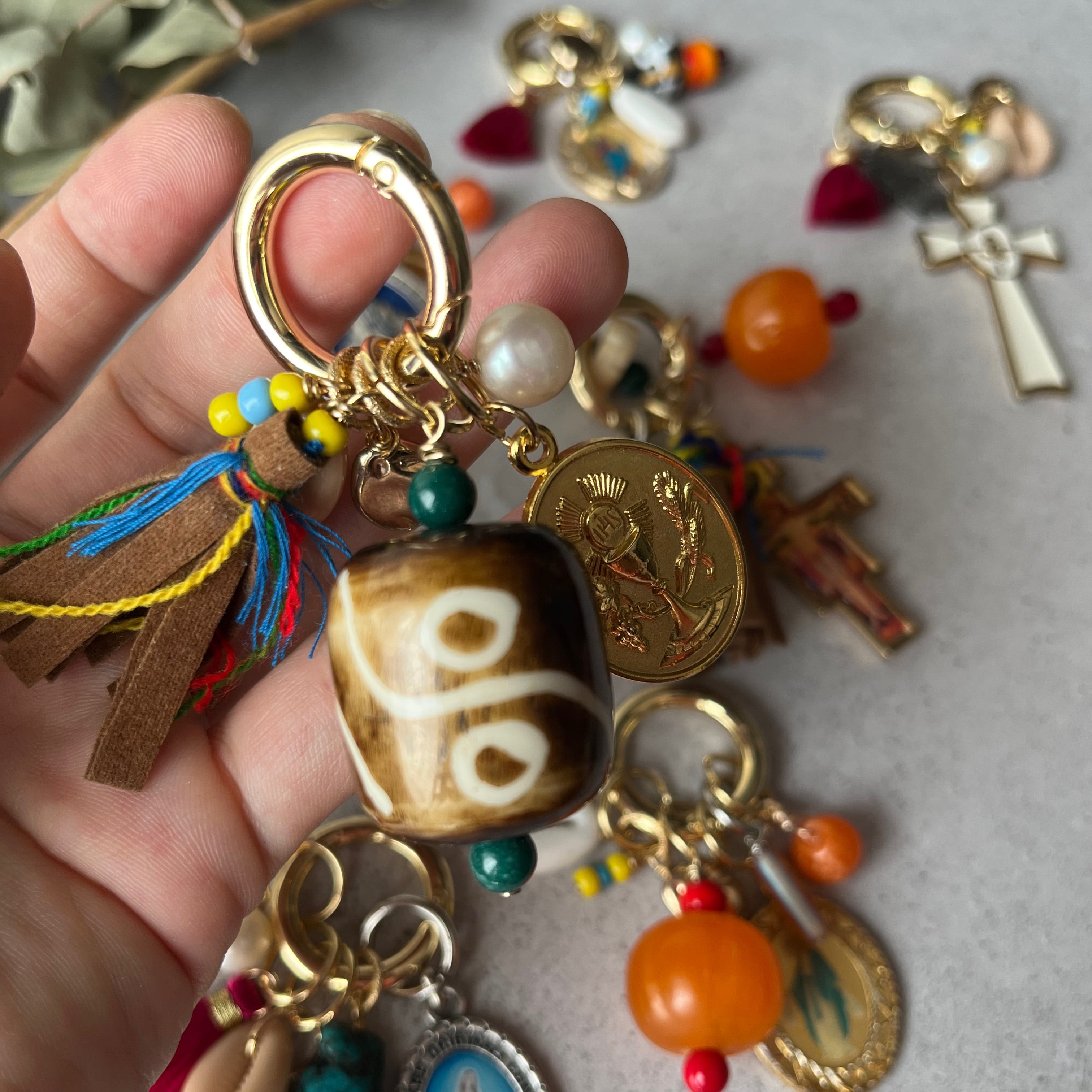 メダイをポイントにカラフルでじゃらじゃらとボリューミーなバッグチャーム