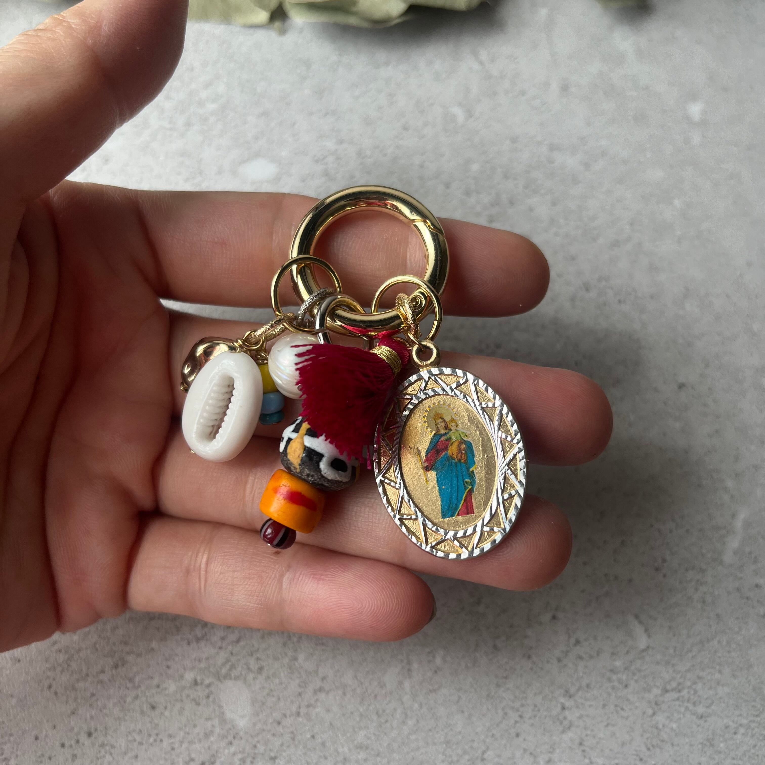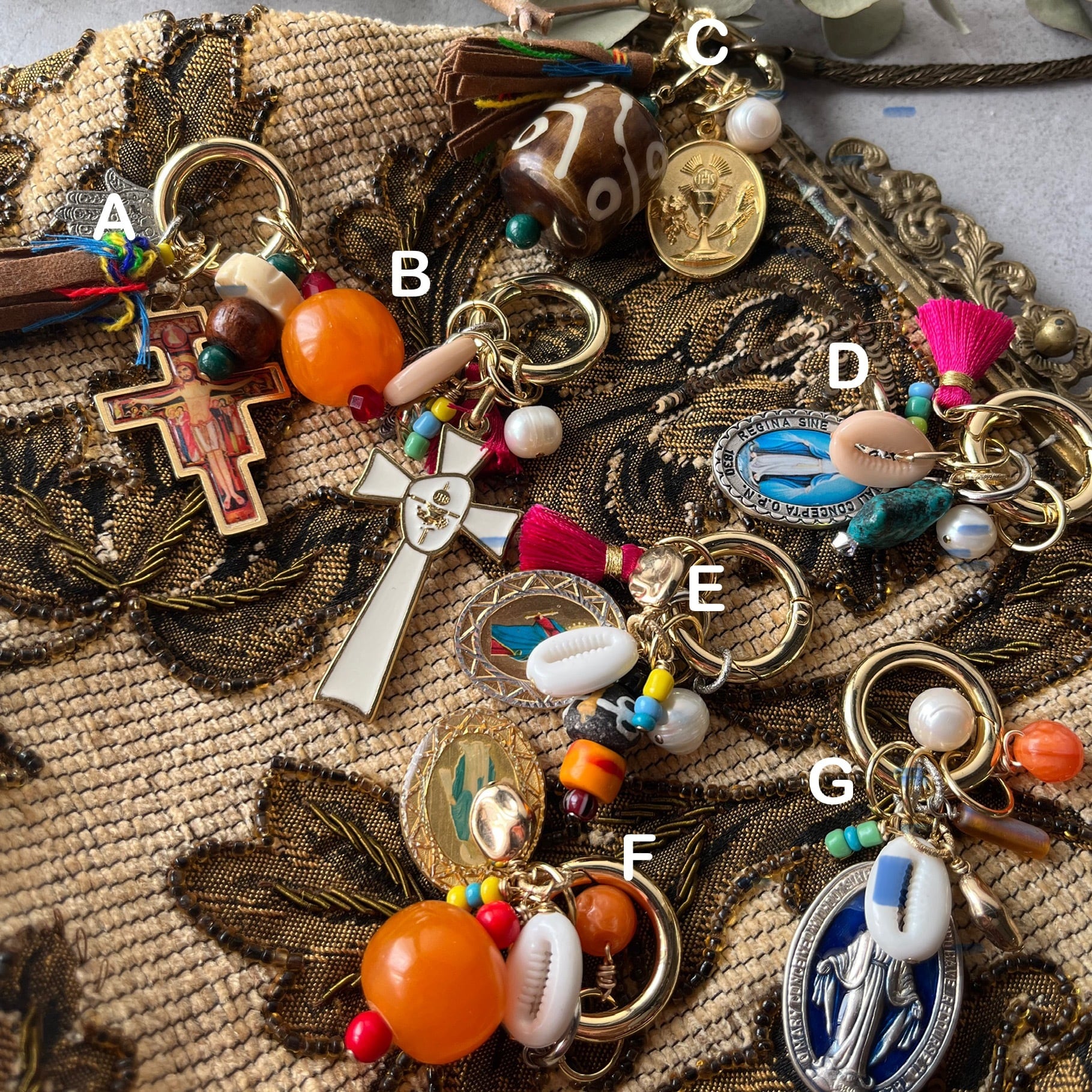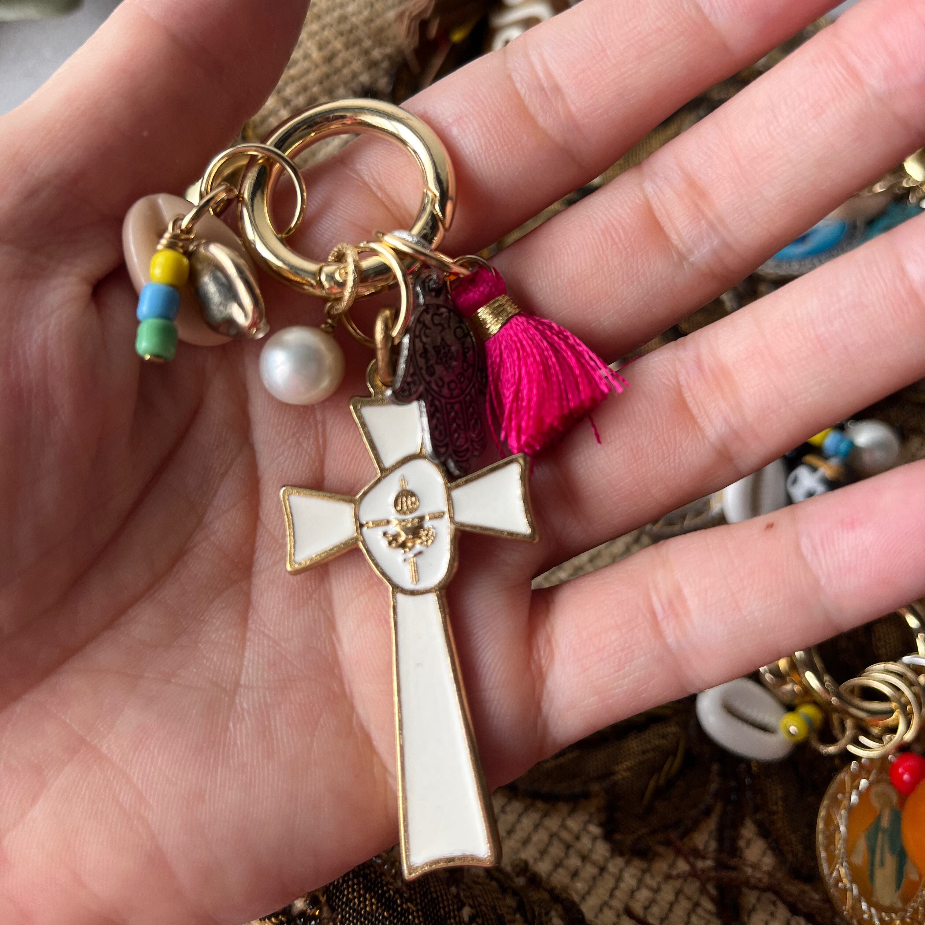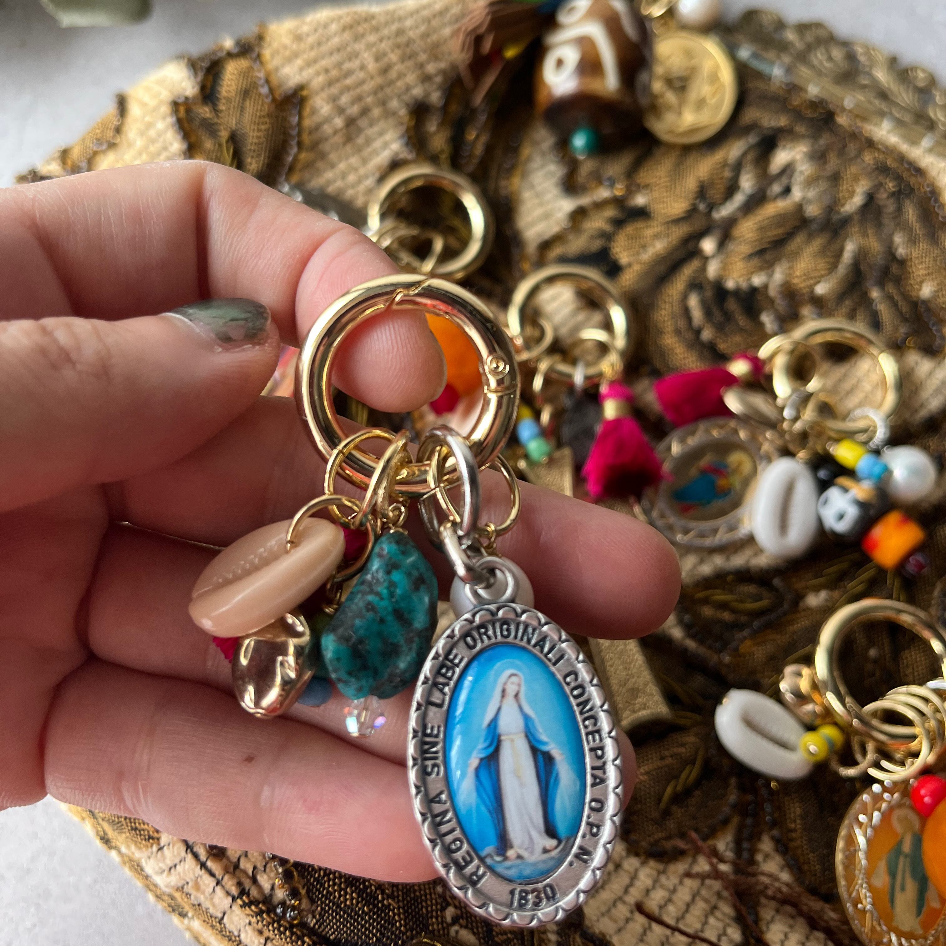 メダイをポイントにカラフルでじゃらじゃらとボリューミーなバッグチャーム