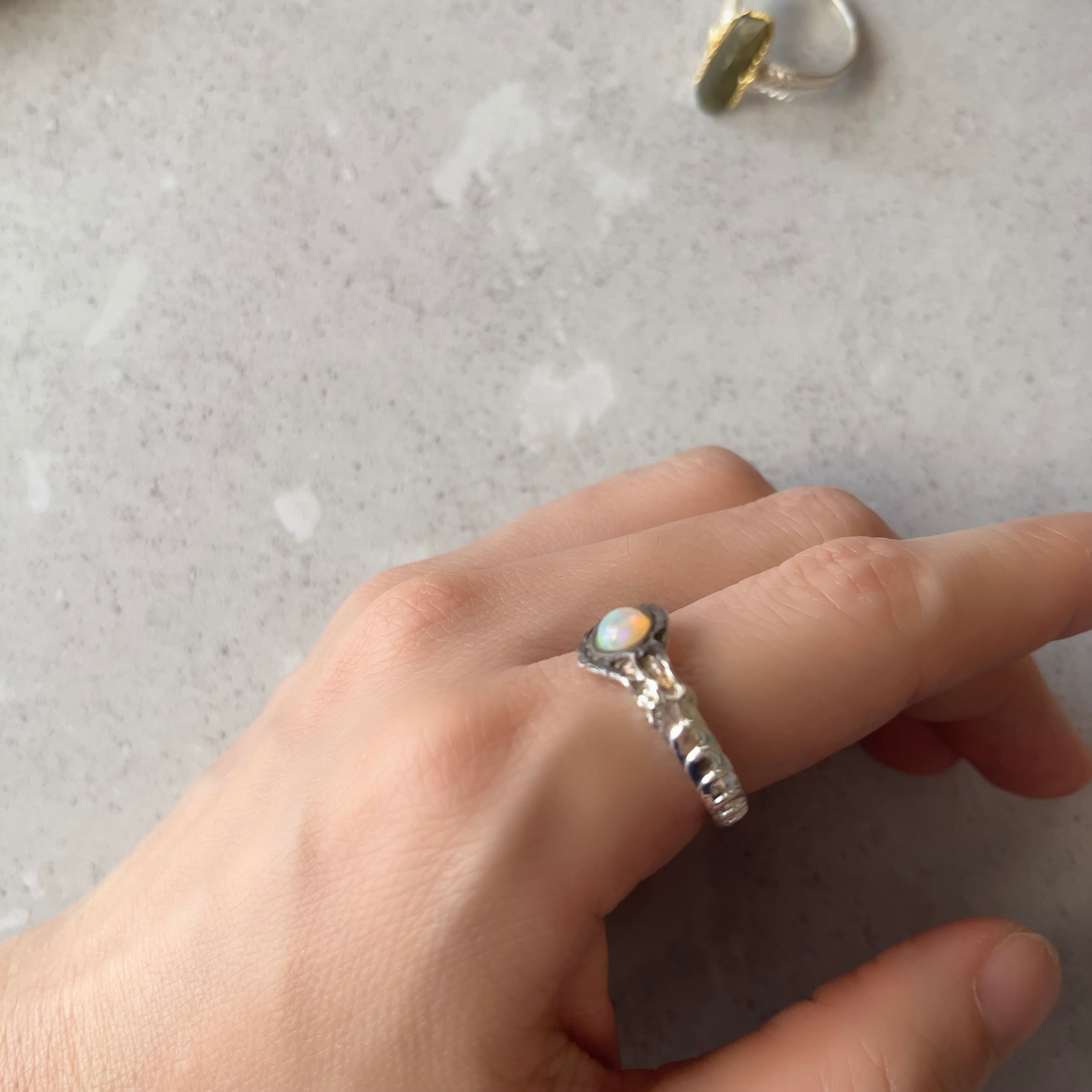 柔らかなグレーとシルバーのコントラストが、オパールの繊細な遊色を美しく引き立てるデザイン。