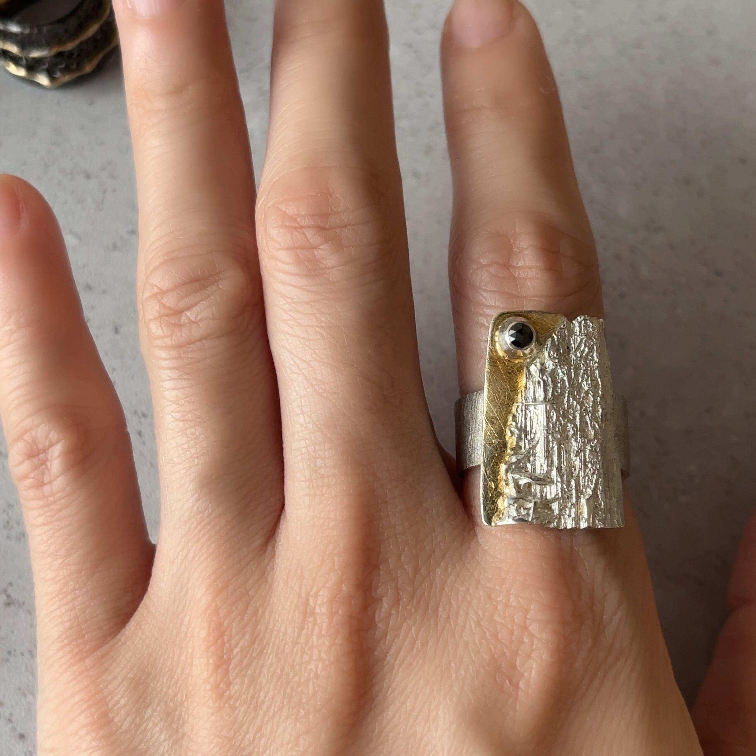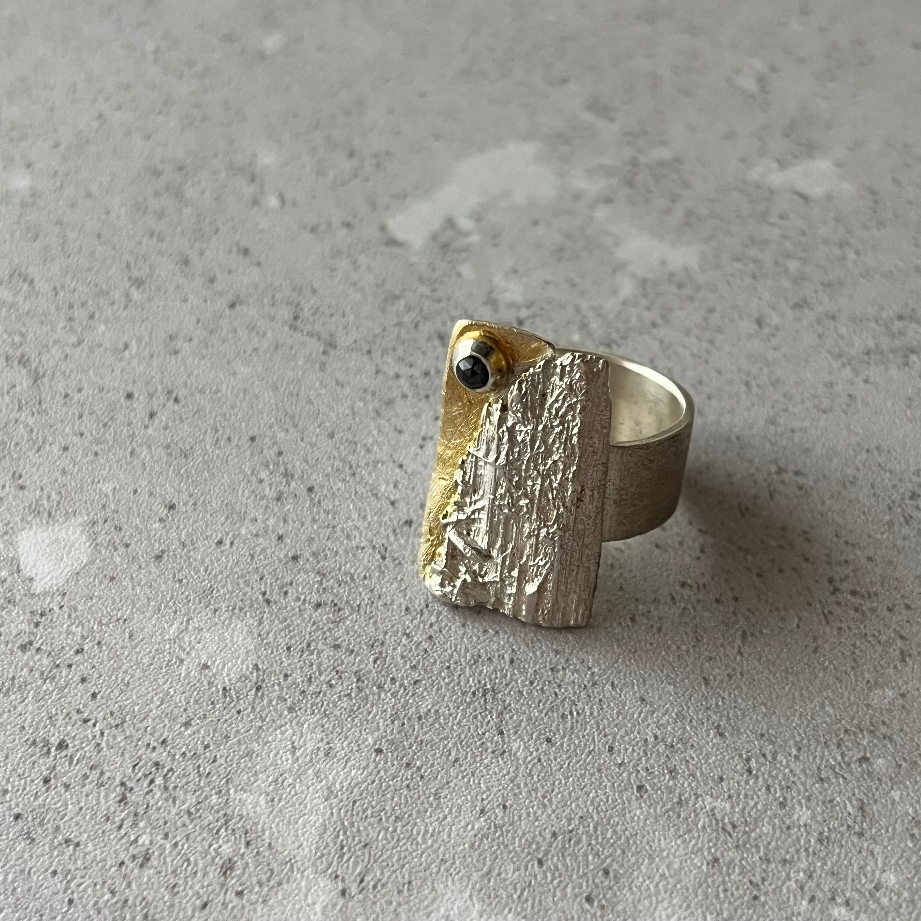 深みのある黒い輝きのブラックダイヤを使い、無骨さの中に上品さを感じるメンズライクなデザインリング