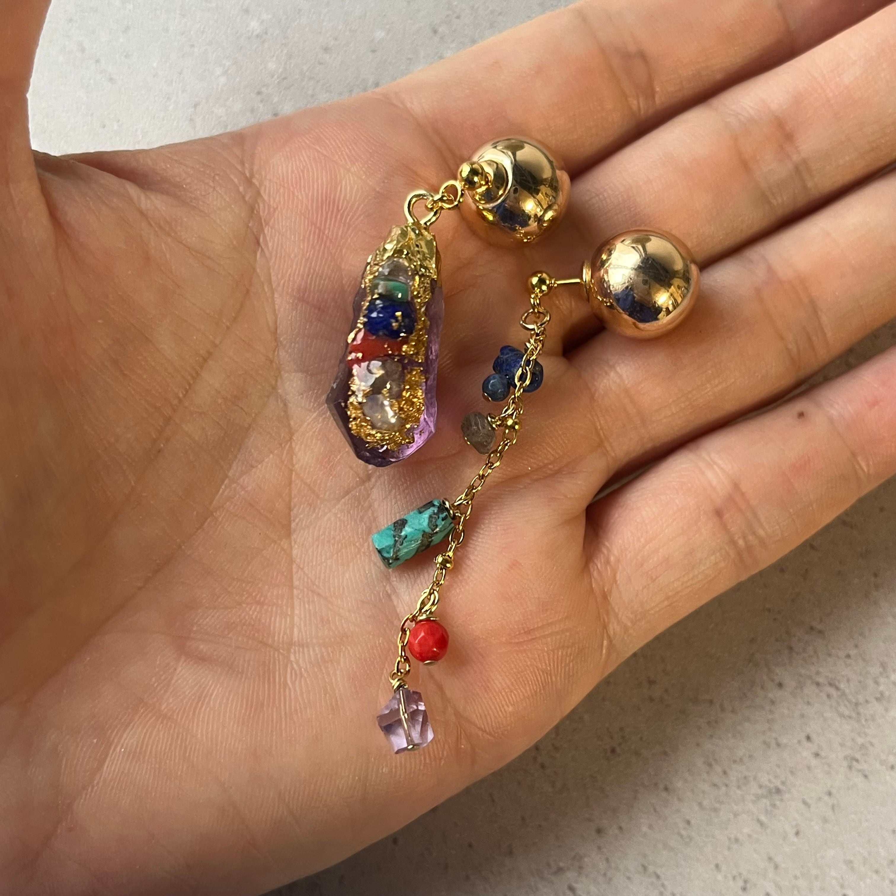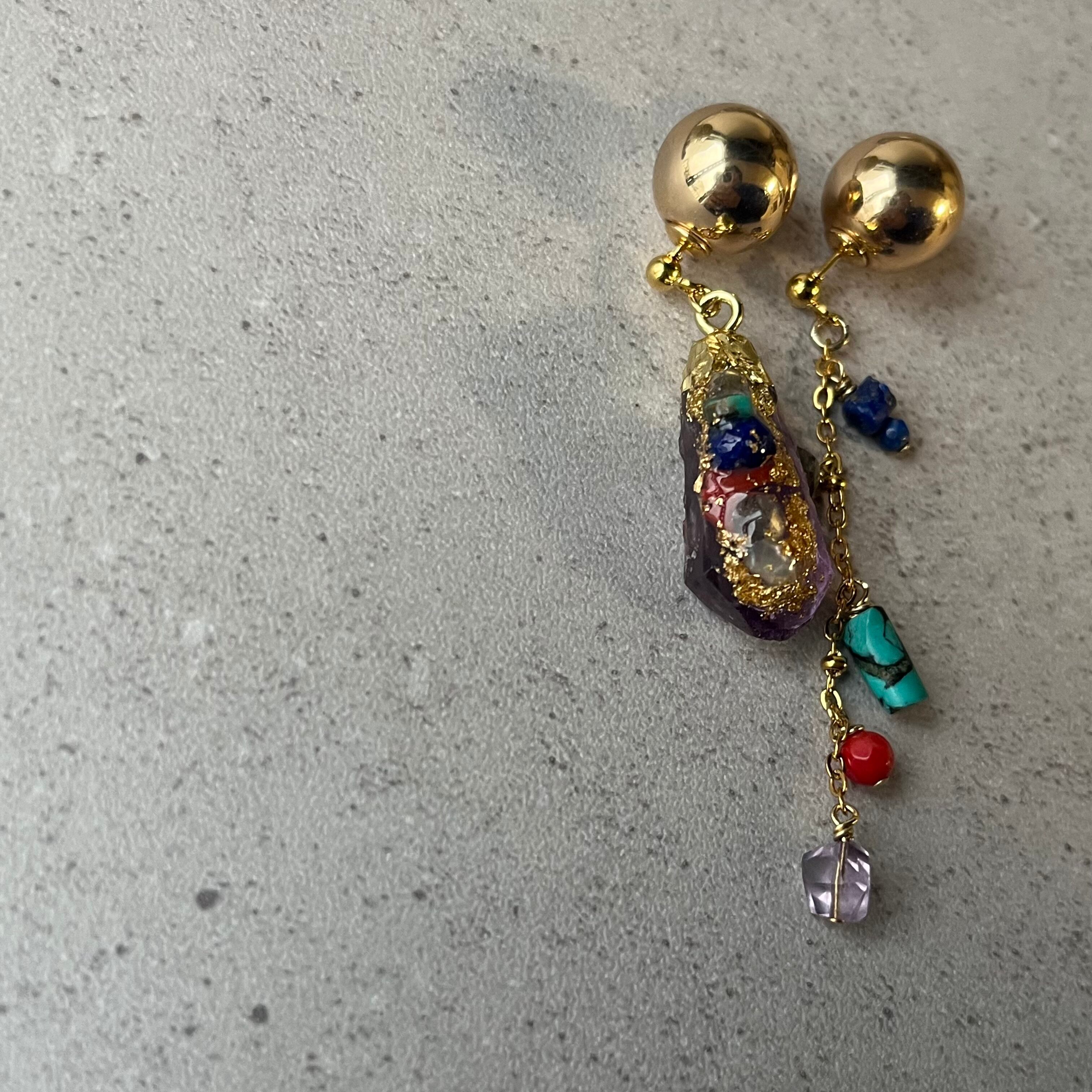 アメジストにカラフルな天然石やパールなどを装飾したアシンメトリーなアイテム。
