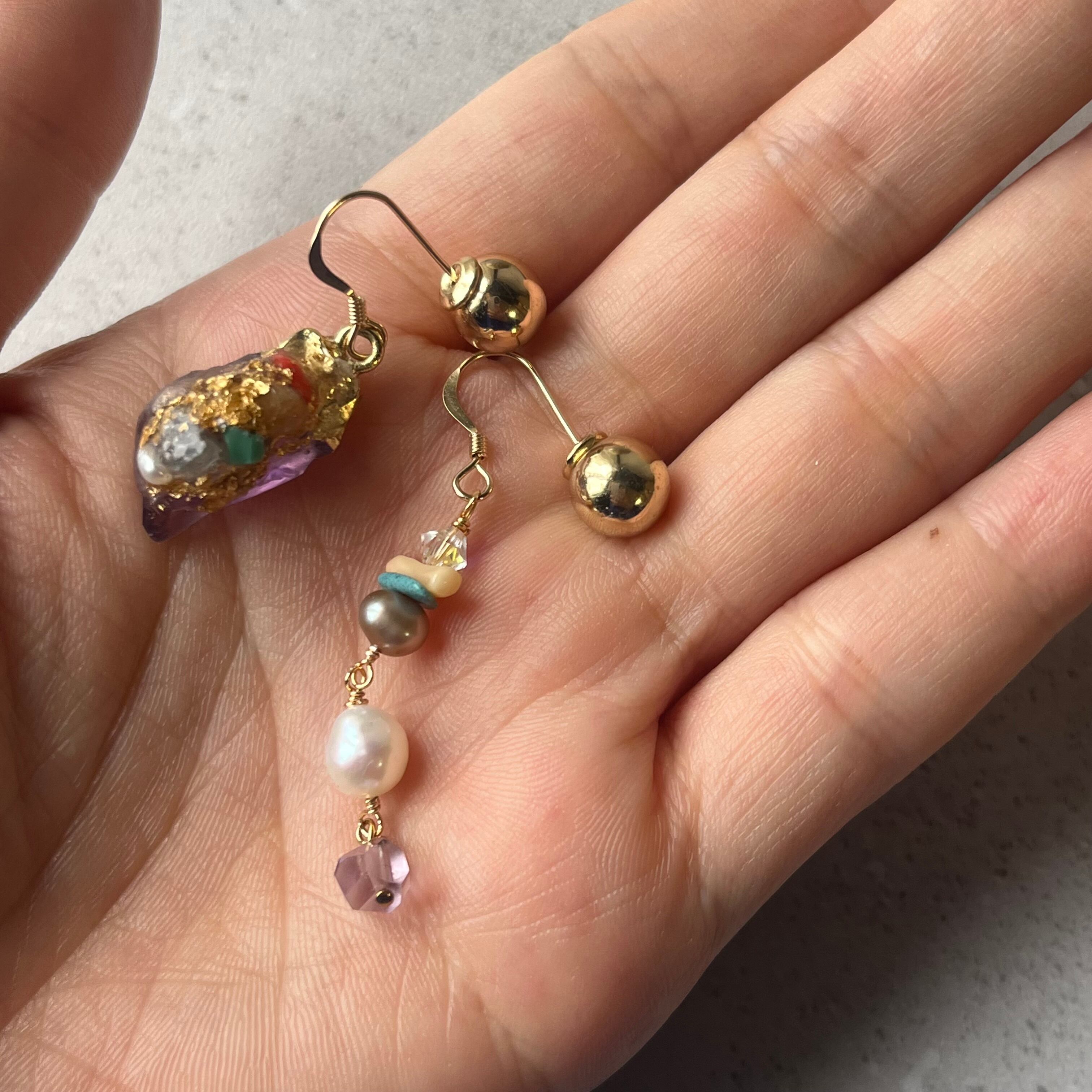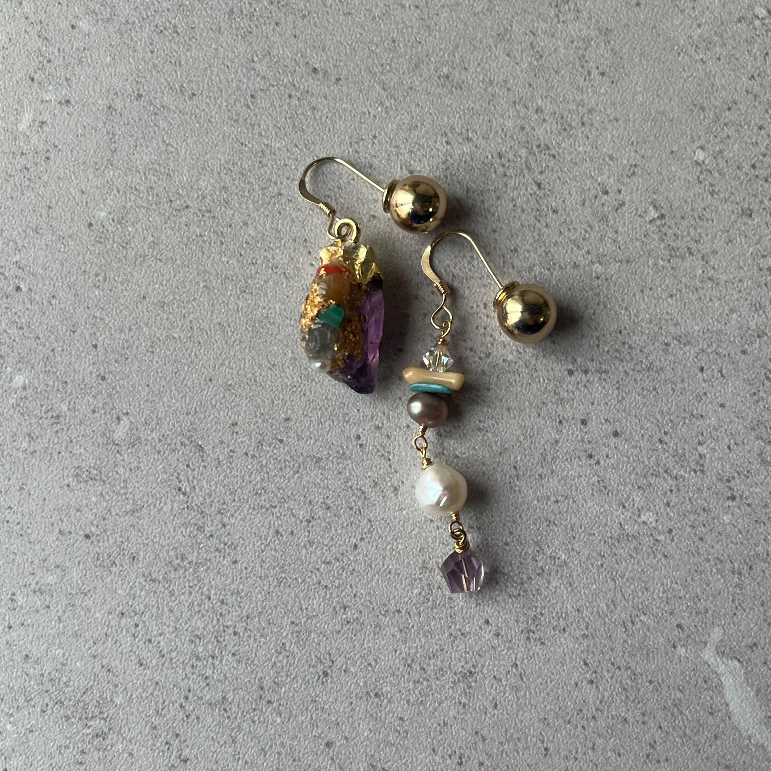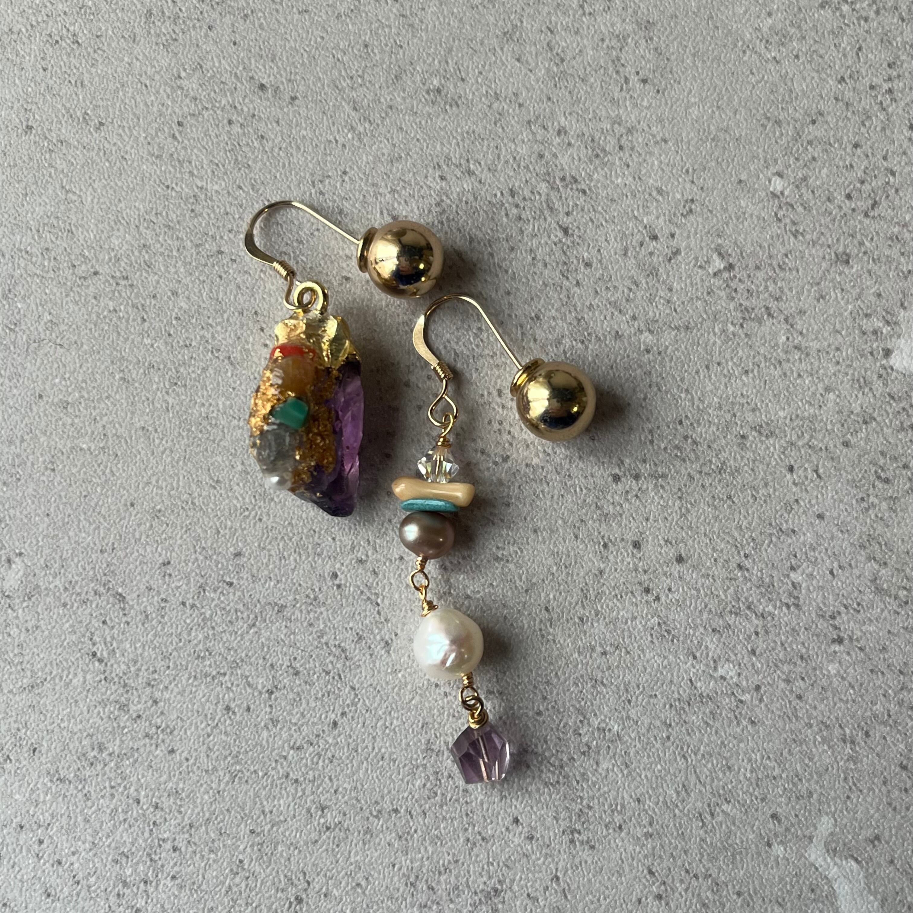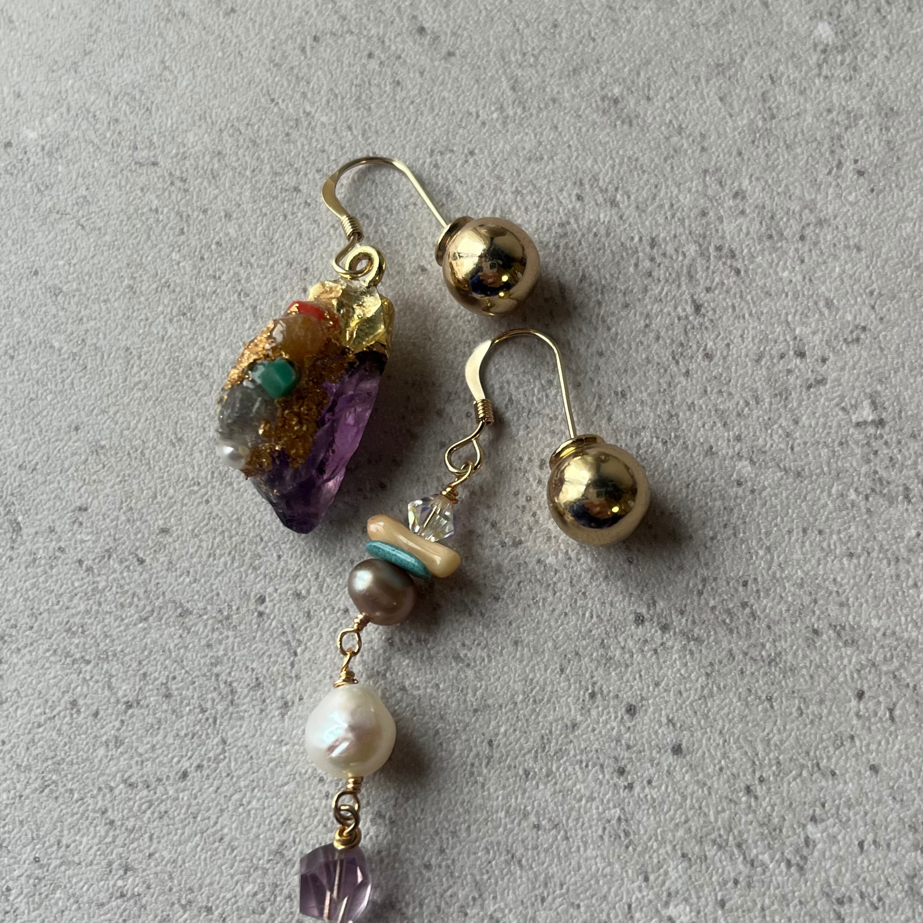 アメジストにカラフルな天然石やパールなどを装飾したアシンメトリーなアイテム。