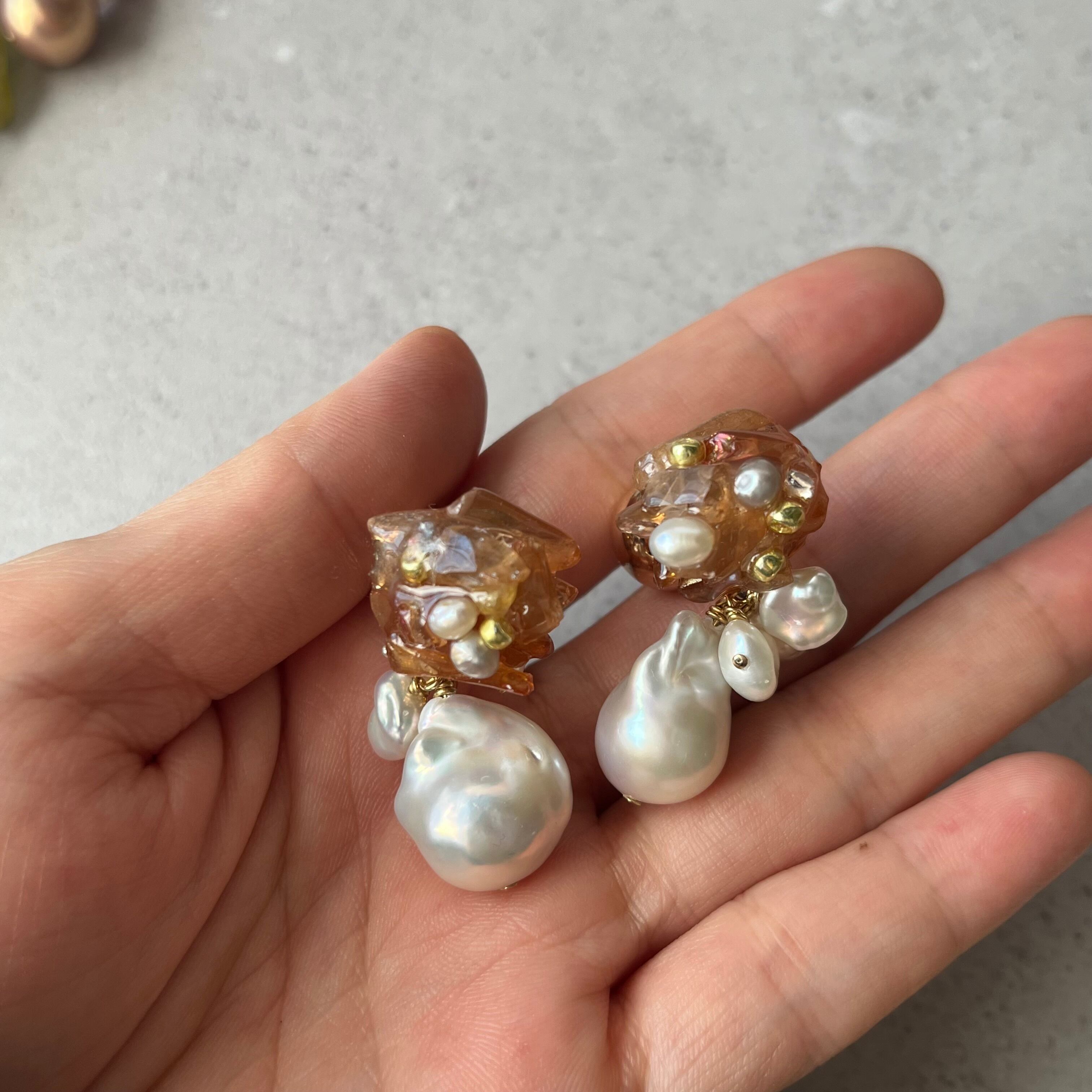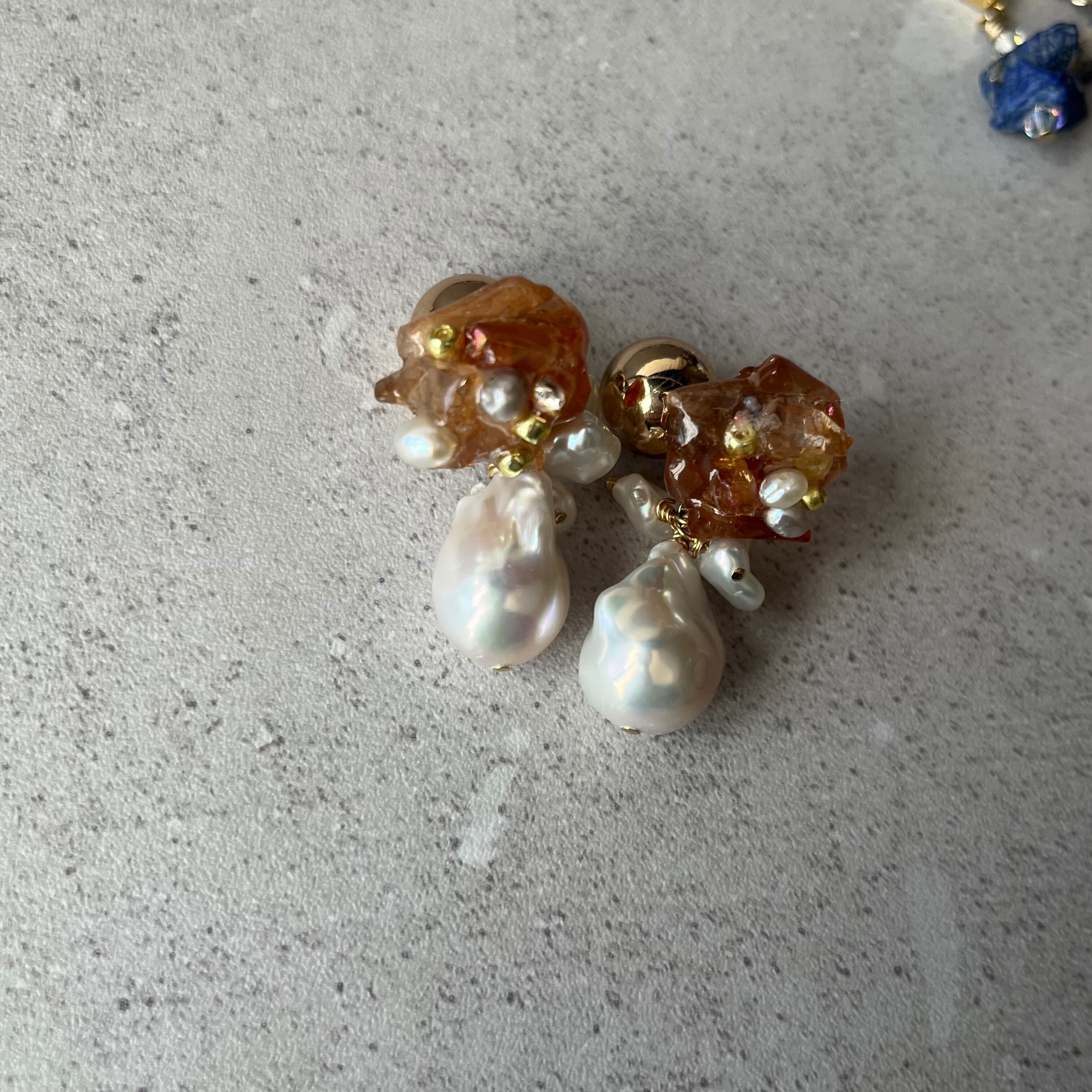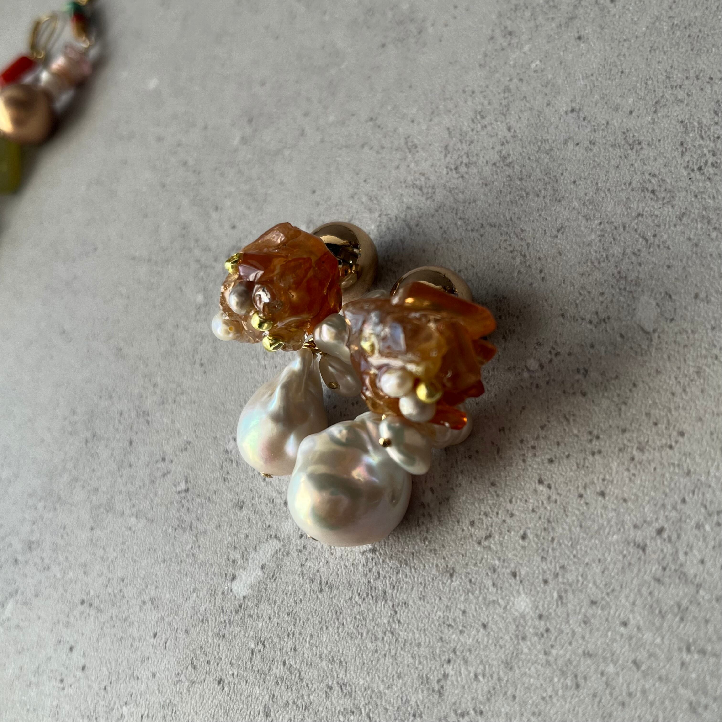 氷柱状のオレンジに色付けた水晶と、大粒のバロック淡水パールやビーズやパールなどを組み合わせたアイテム。