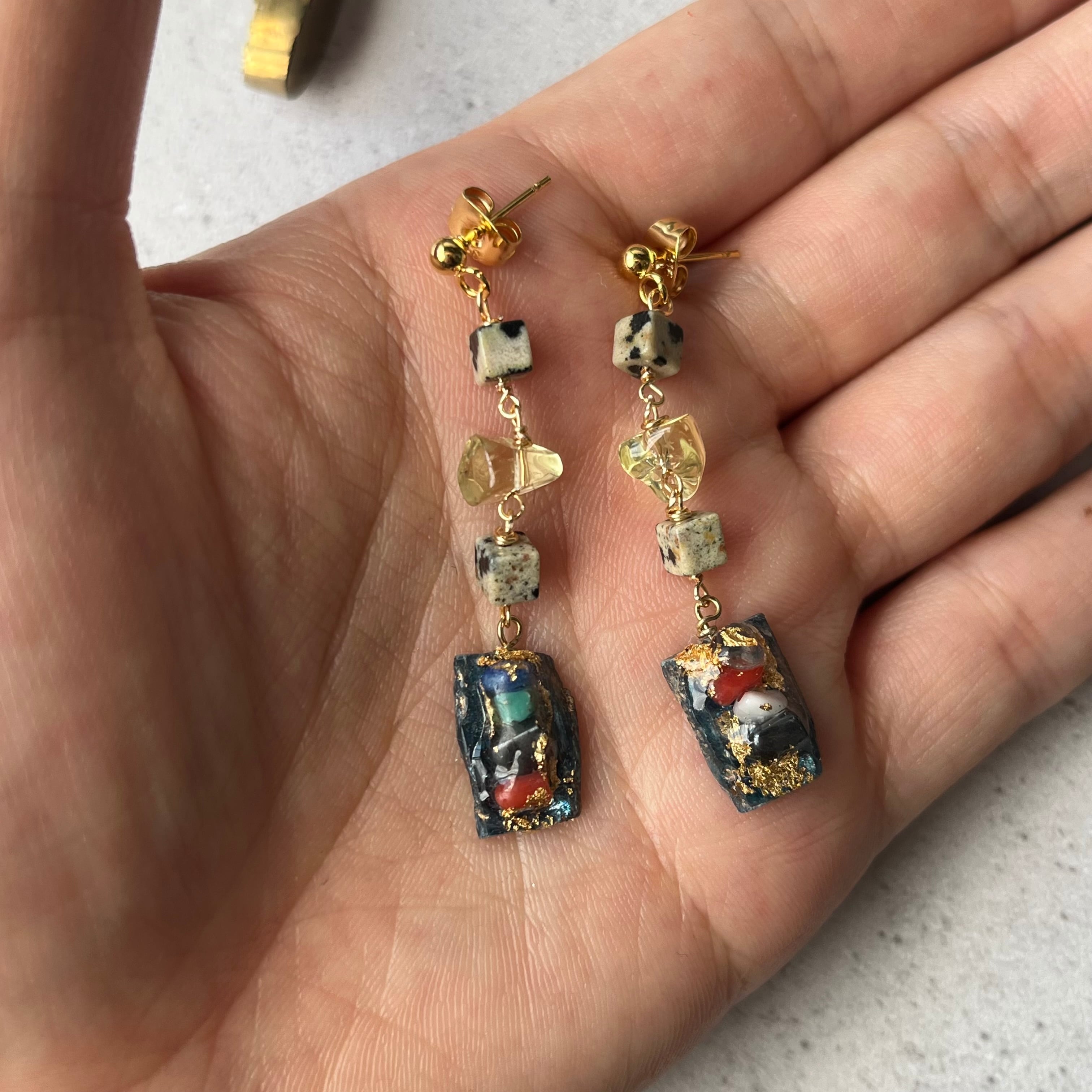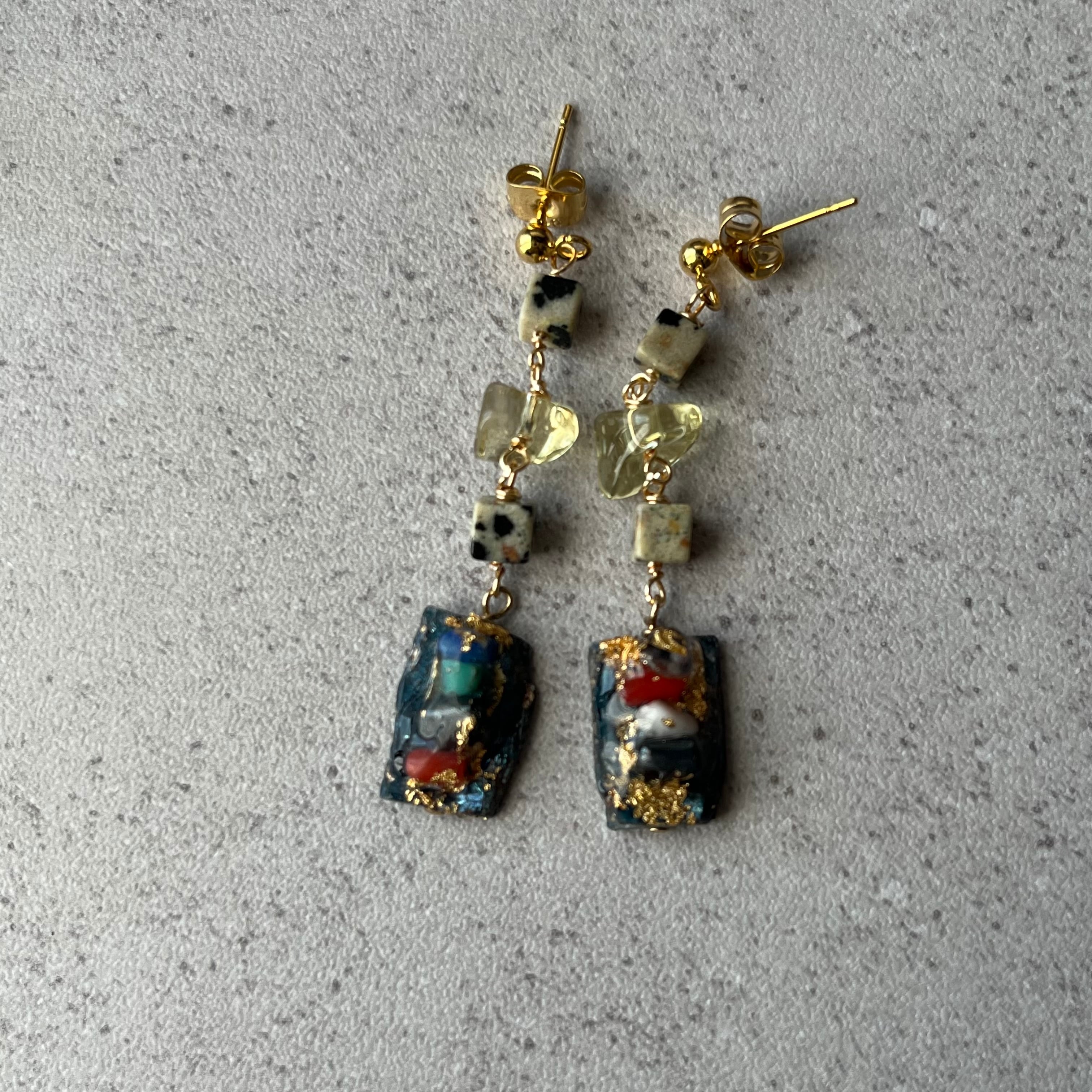 カラフルな天然石などを装飾したカイヤナイトと、ダルメシアンジャスパーやレモンクォーツを組み合わせたアイテム。
