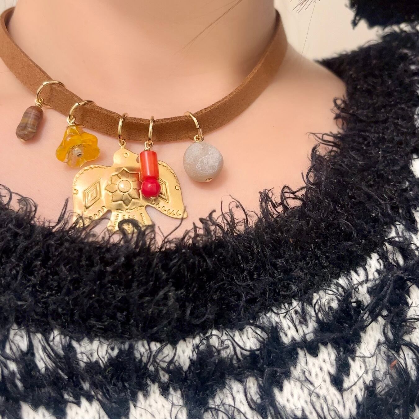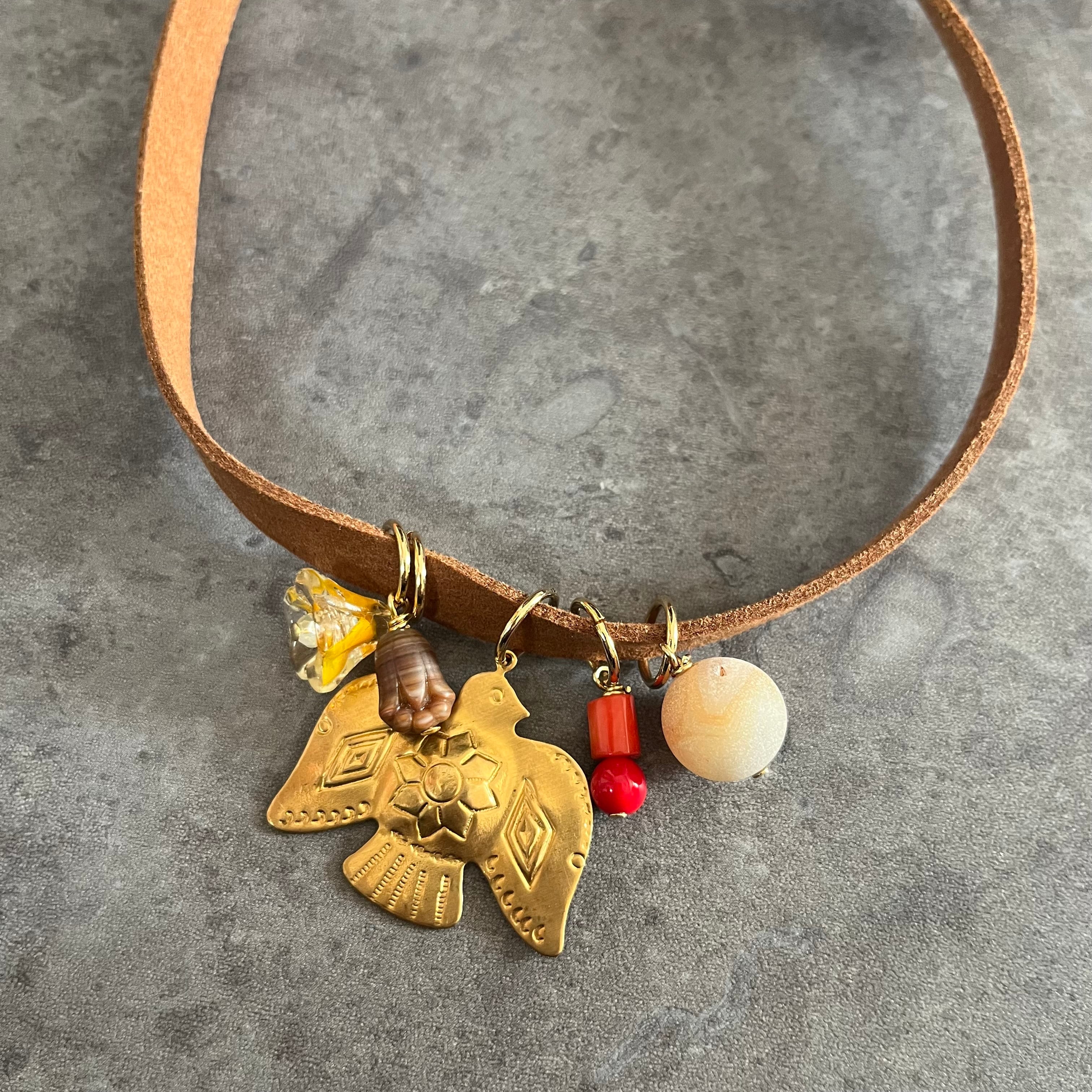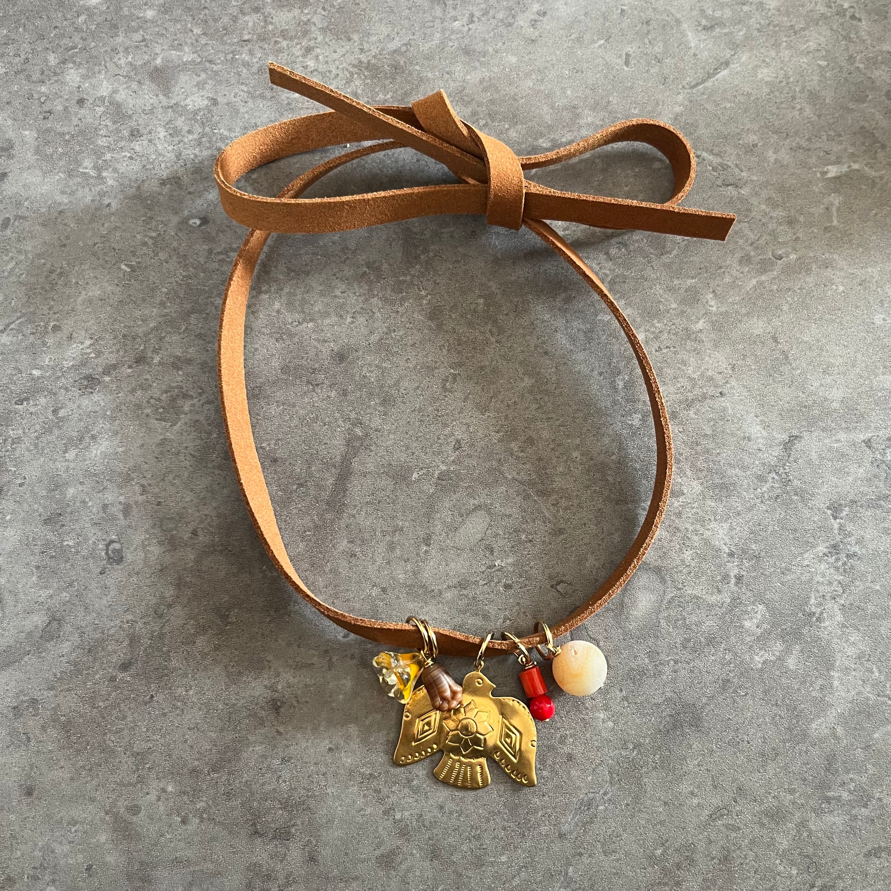 真鍮のイーグルモチーフや、トレジャー瑪瑙、サンゴ、ガラスビーズなどをトップに使用した3wayチョーカーネックレス。