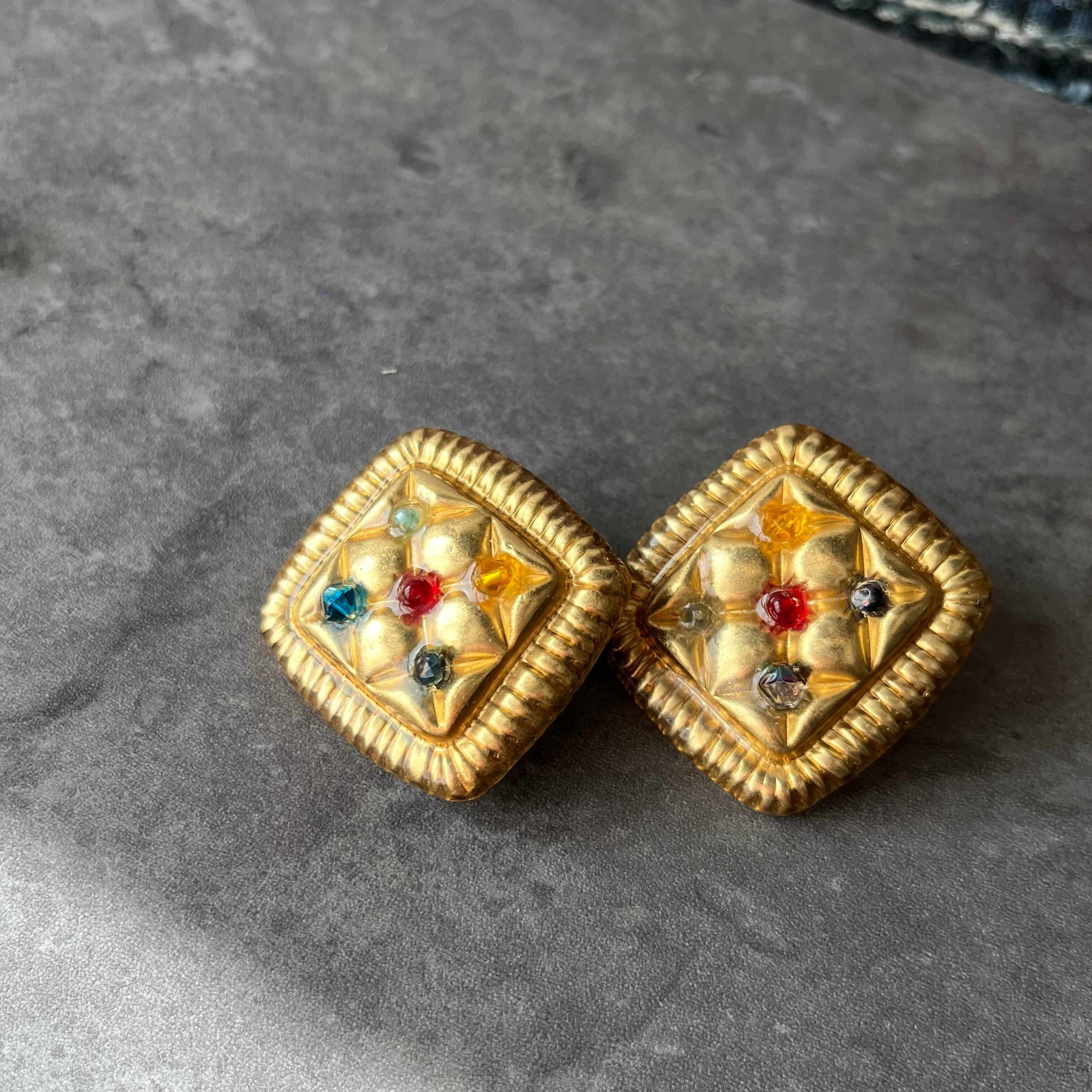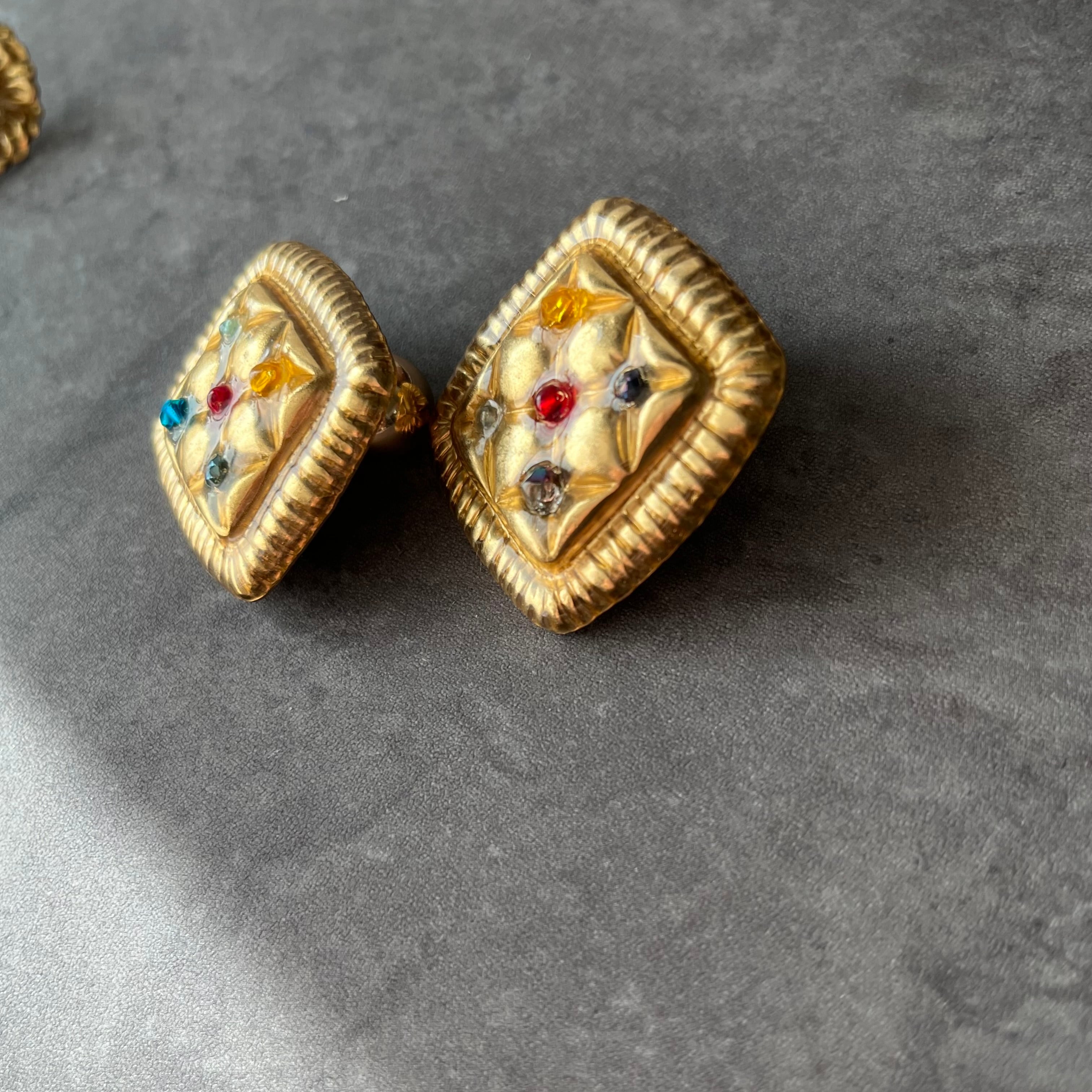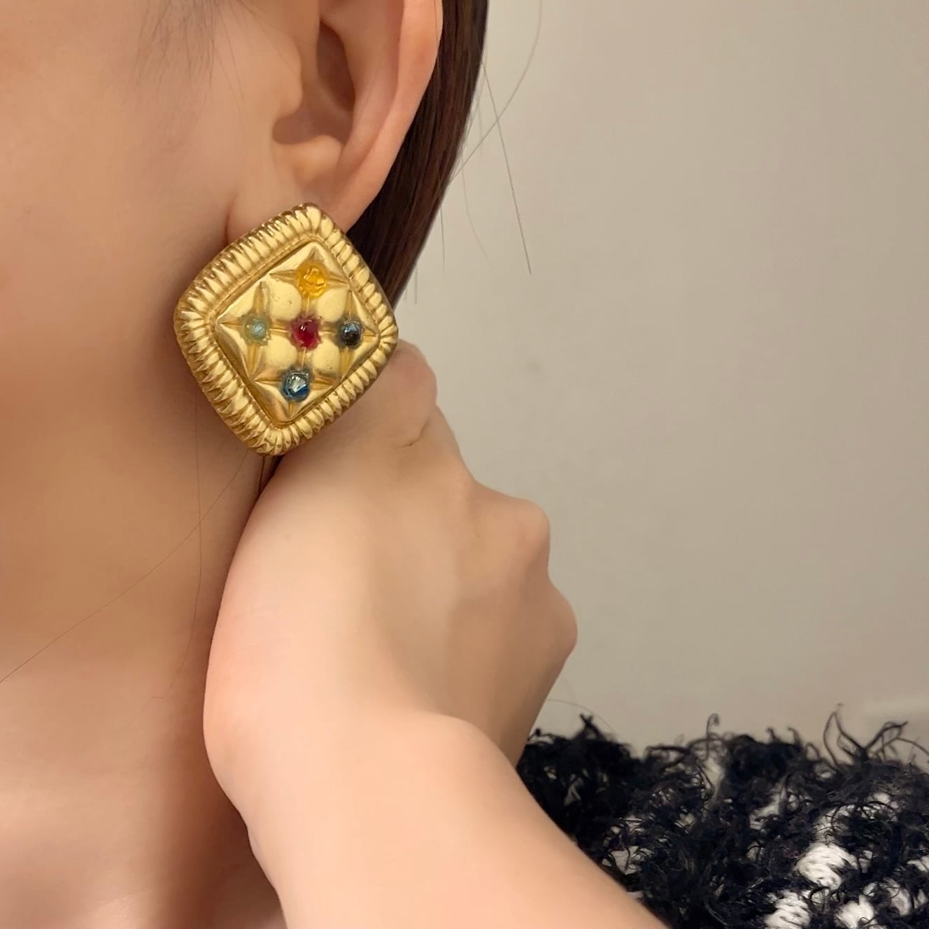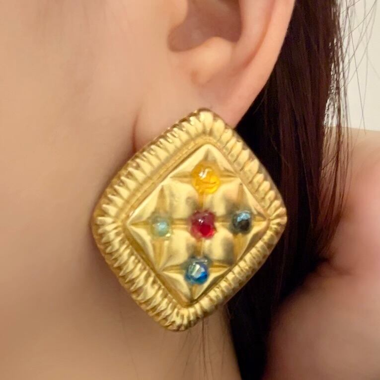 真鍮素材に、5色の宝石のように輝くガラスを散りばめたボリューム感のあるアイテム。