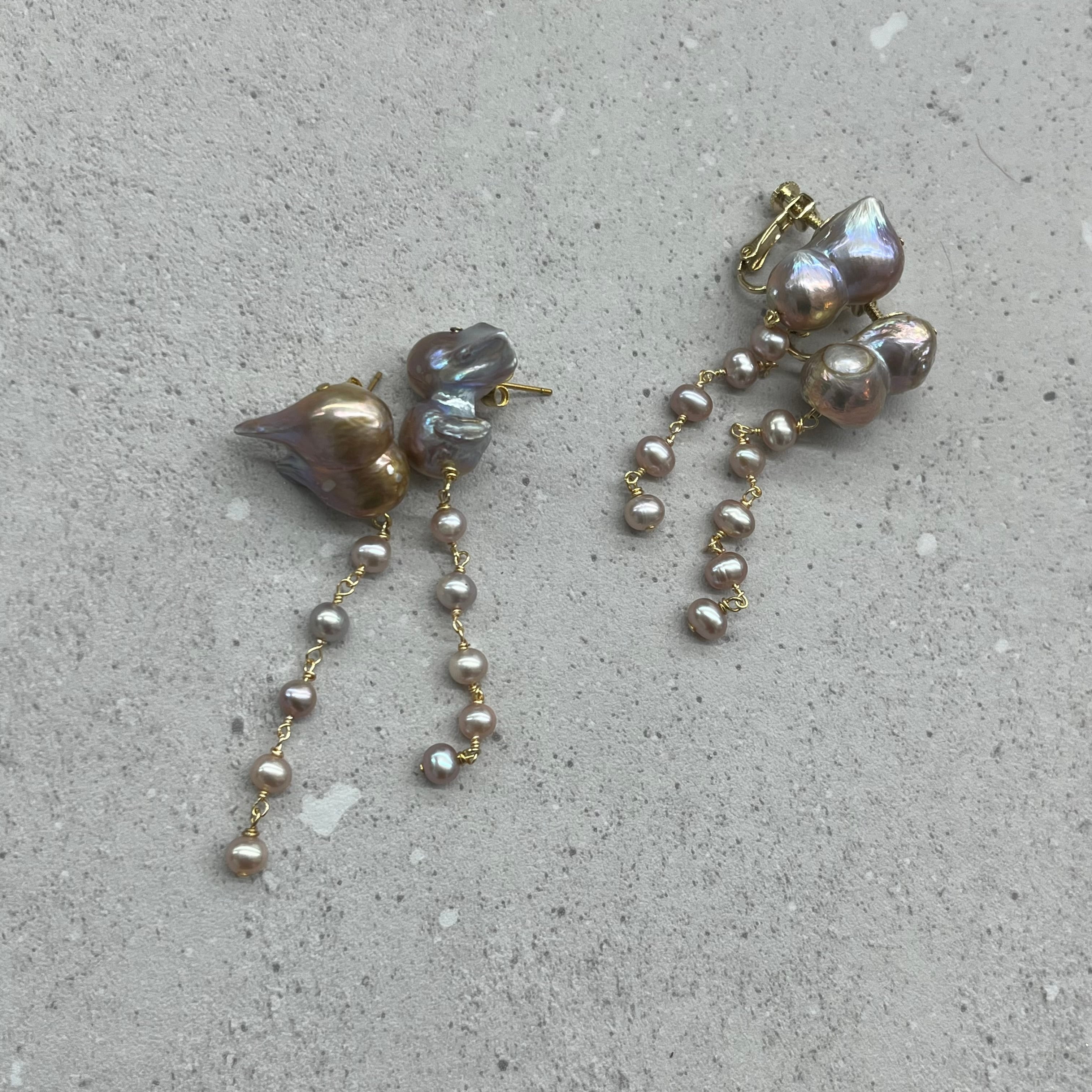 愛らしい唯一無二な変形パールと、ピンクの淡水パールを組み合わせたロングピアス。