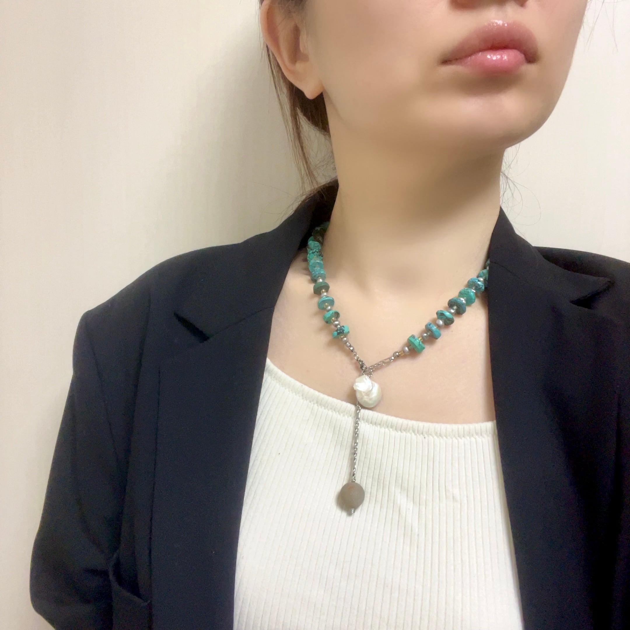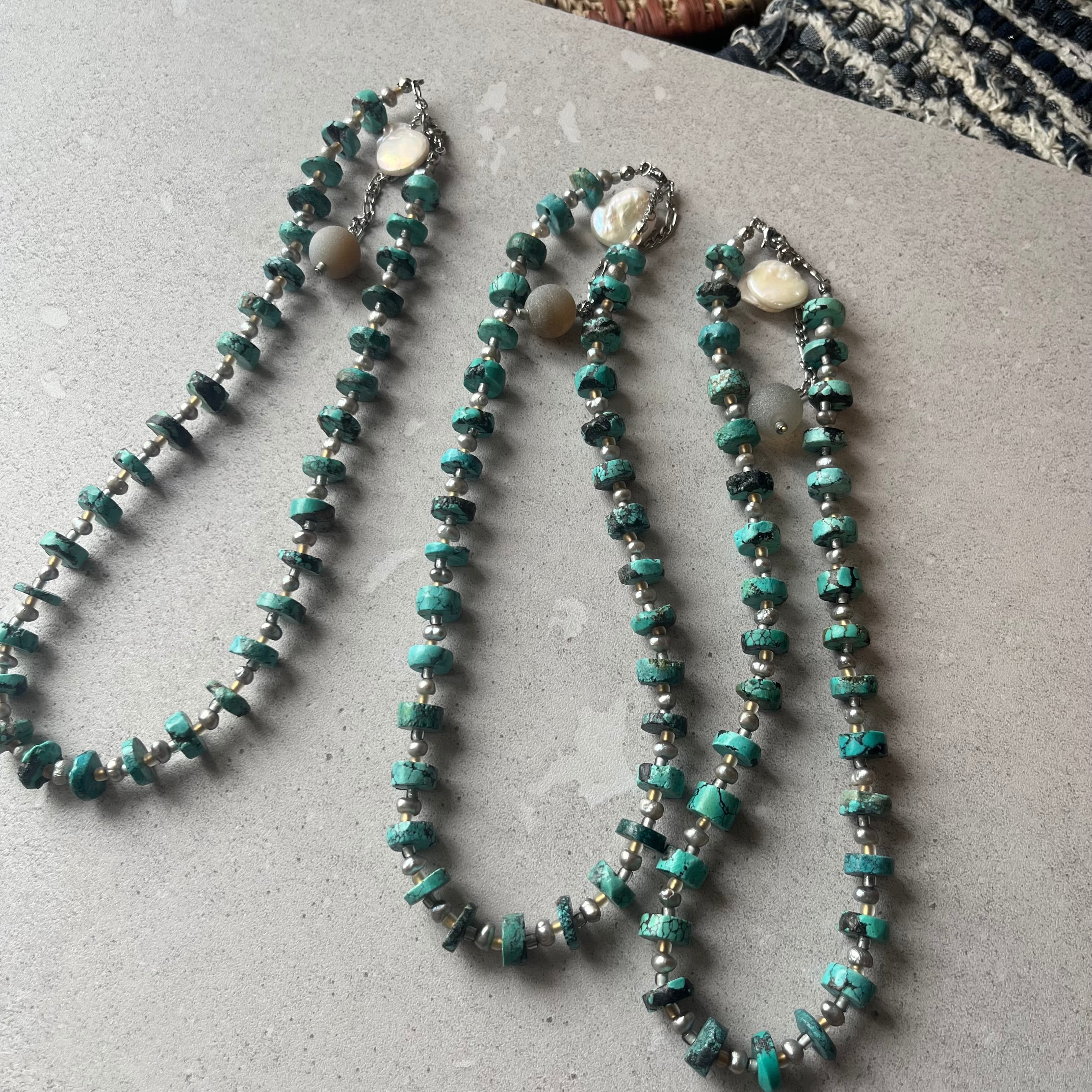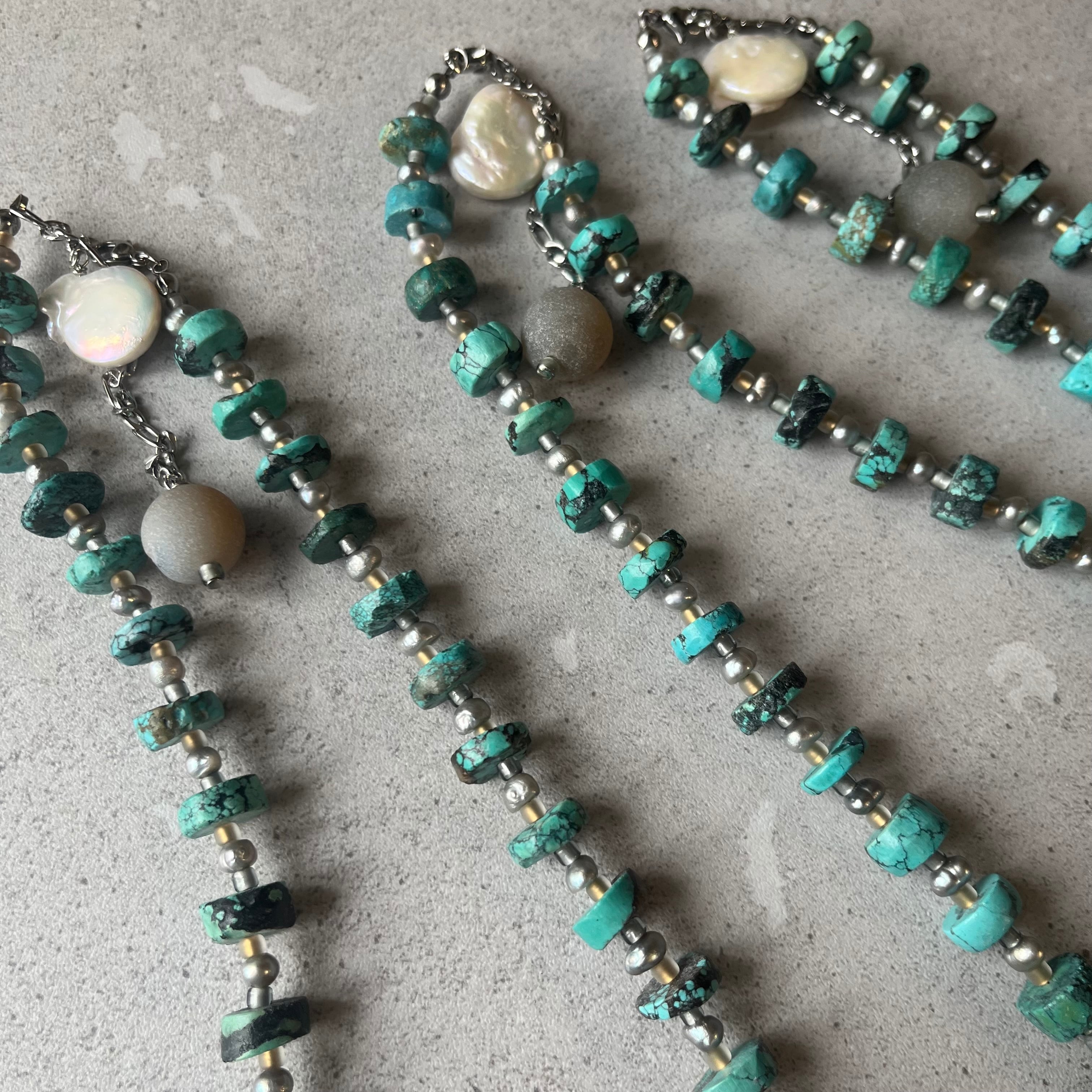 天然トルコ石と、Grayの淡水、ジャパニーズビーズを合わせたボリューミーなネックレス。