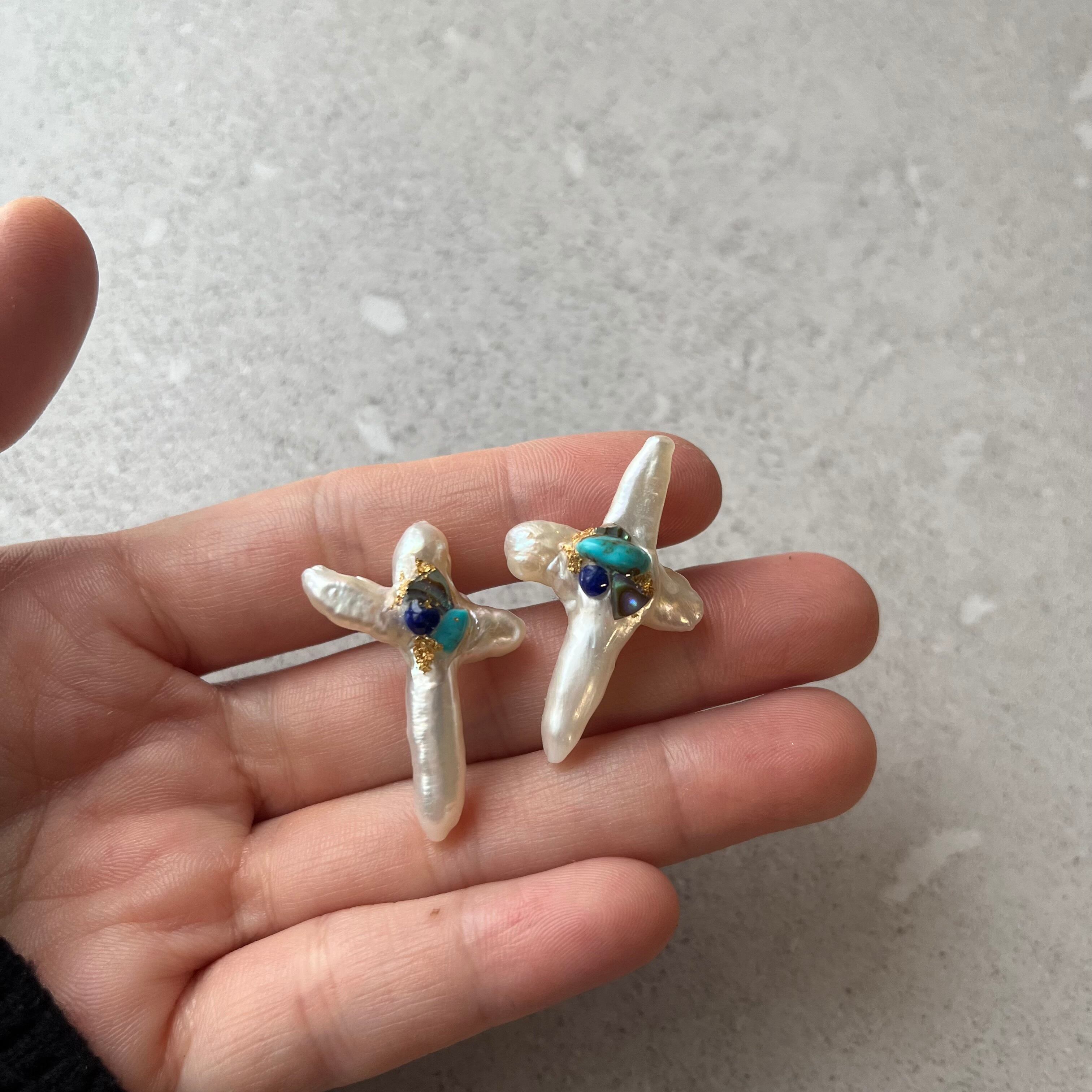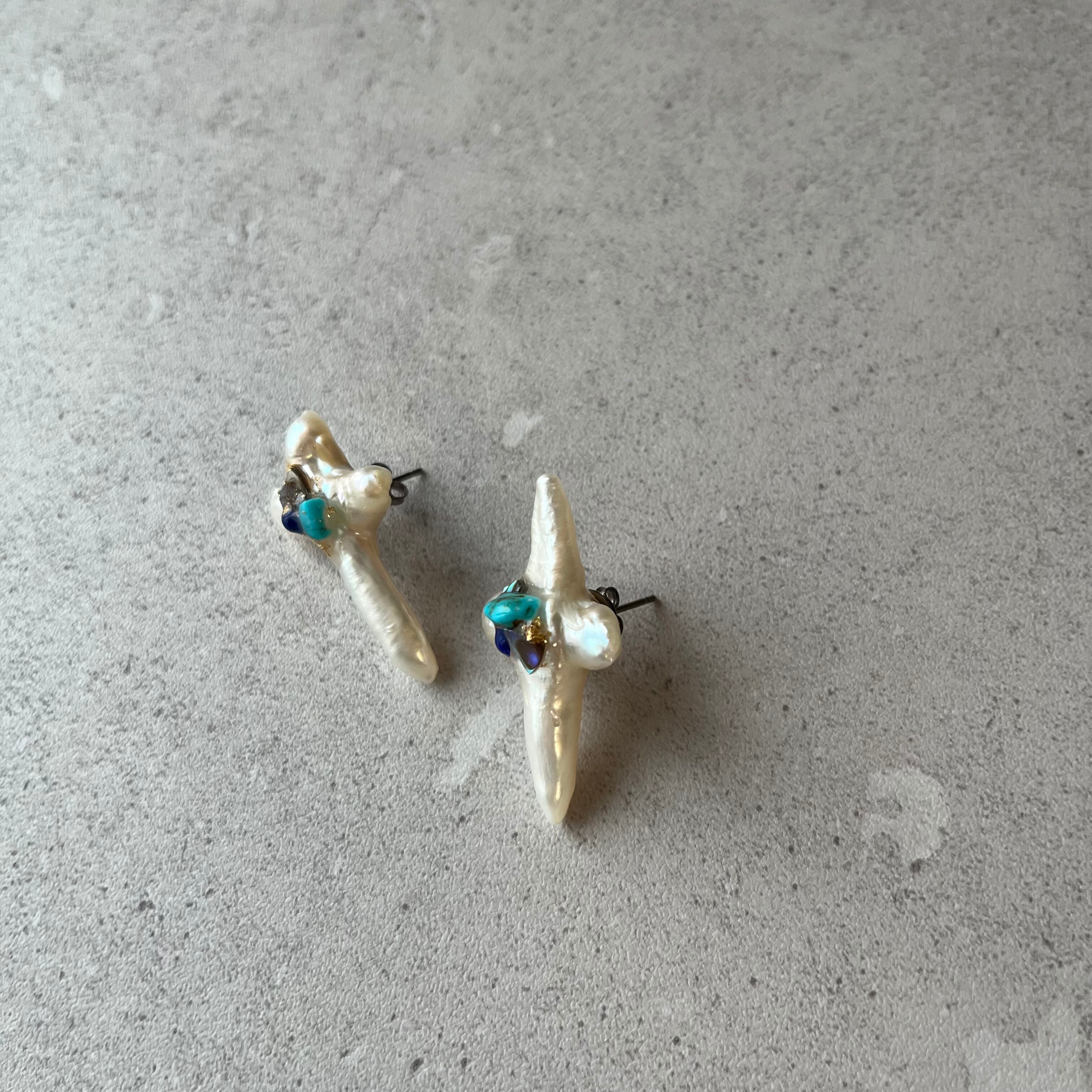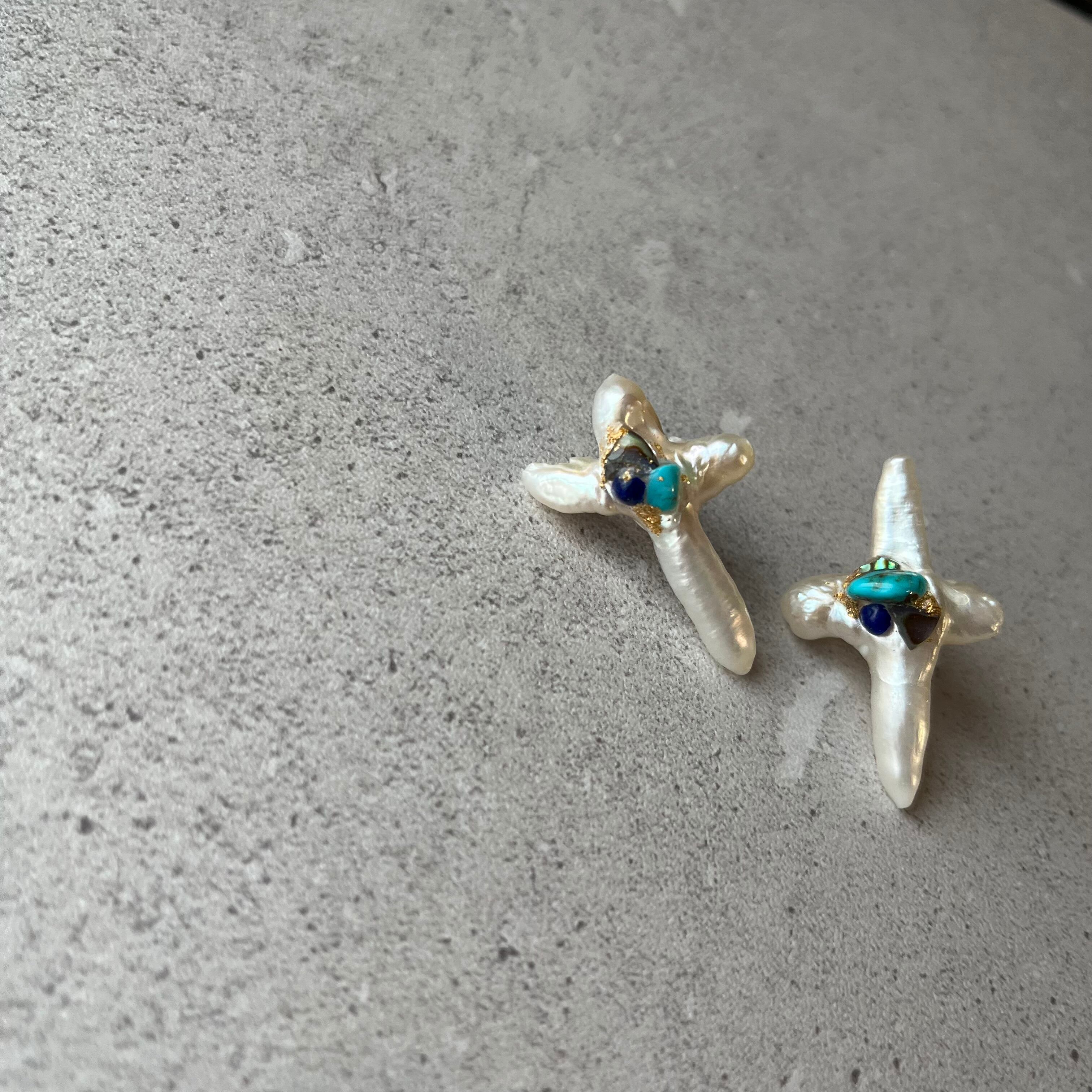 クロスの淡水パールに、ターコイズやラピスラズリ、アバロンシェルなどのカケラを張り合わせたピアス