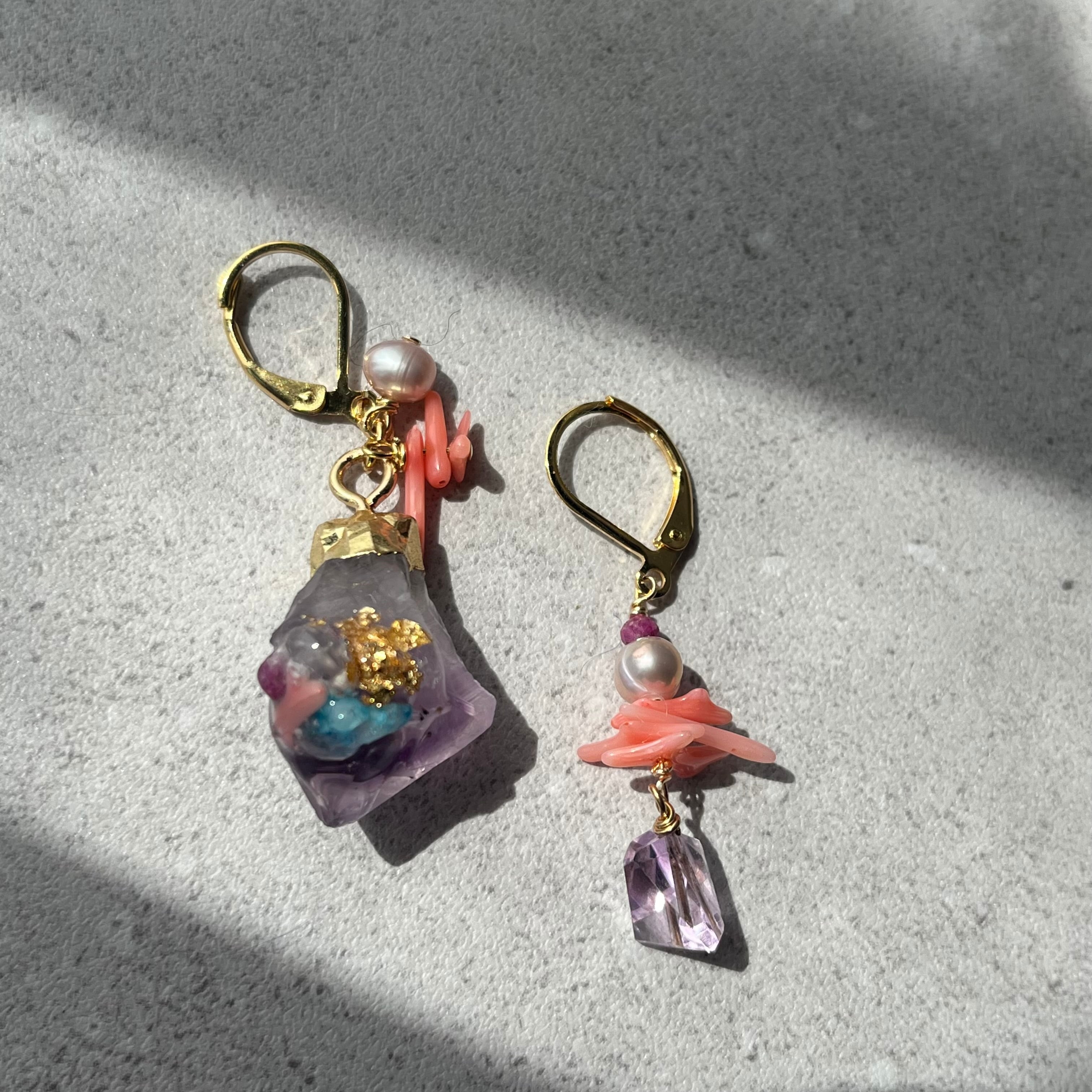 アメジストに天然石やサンゴなどを装飾し、アシンメトリーなデザインに仕上げたアイテム。