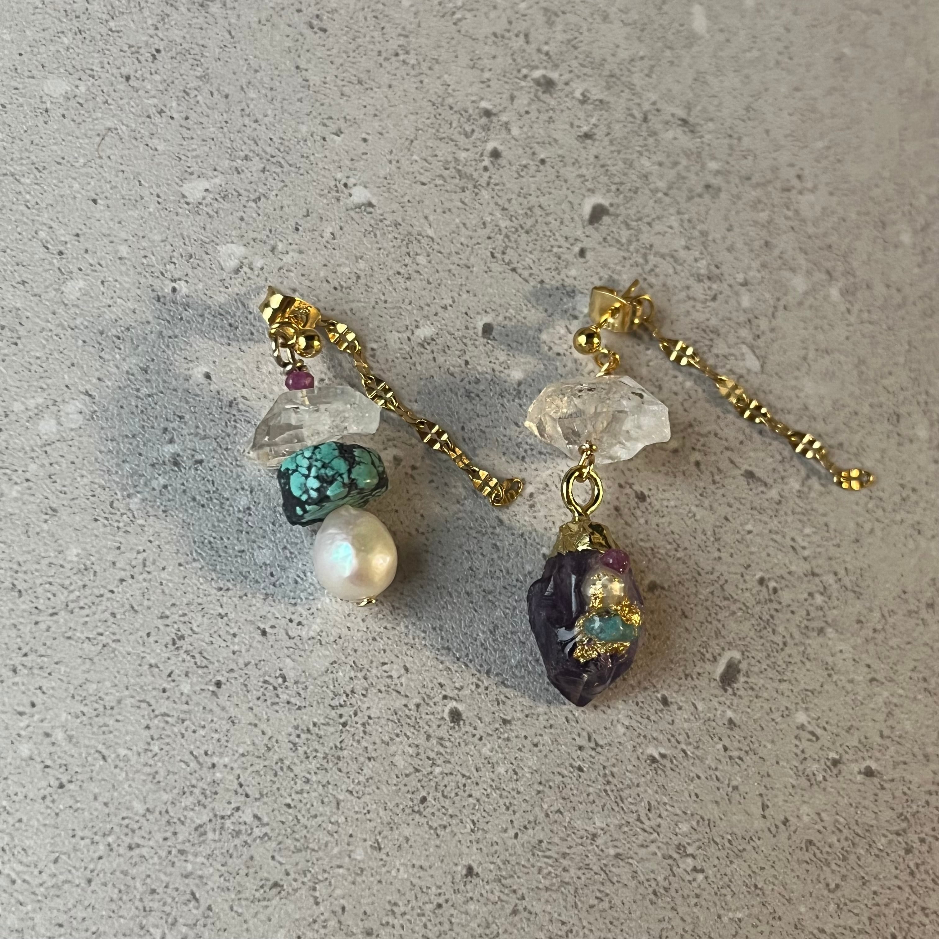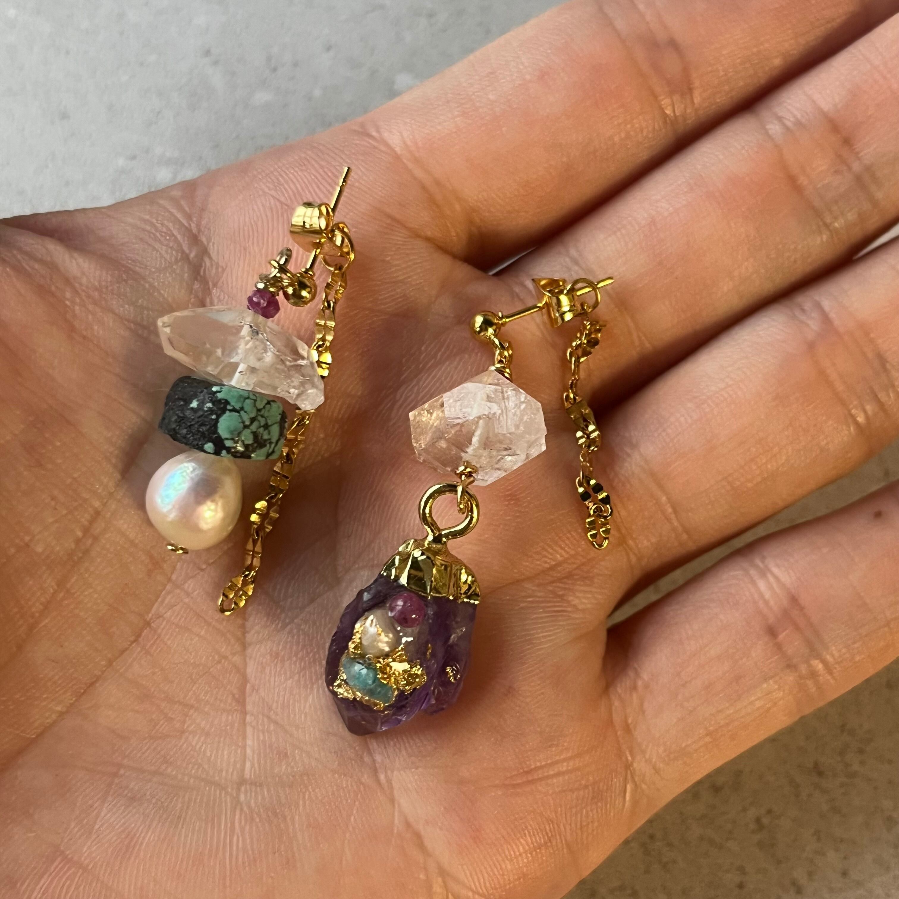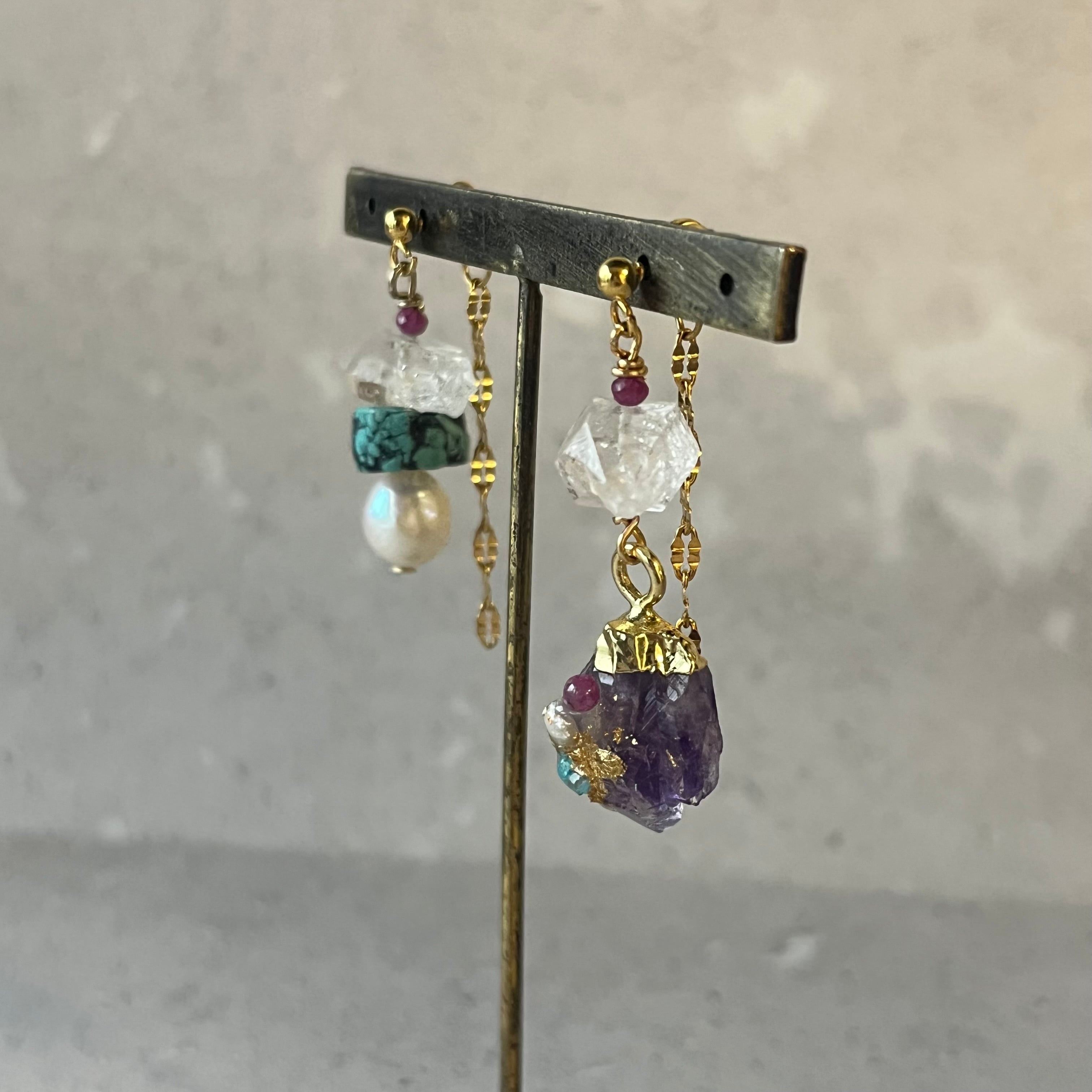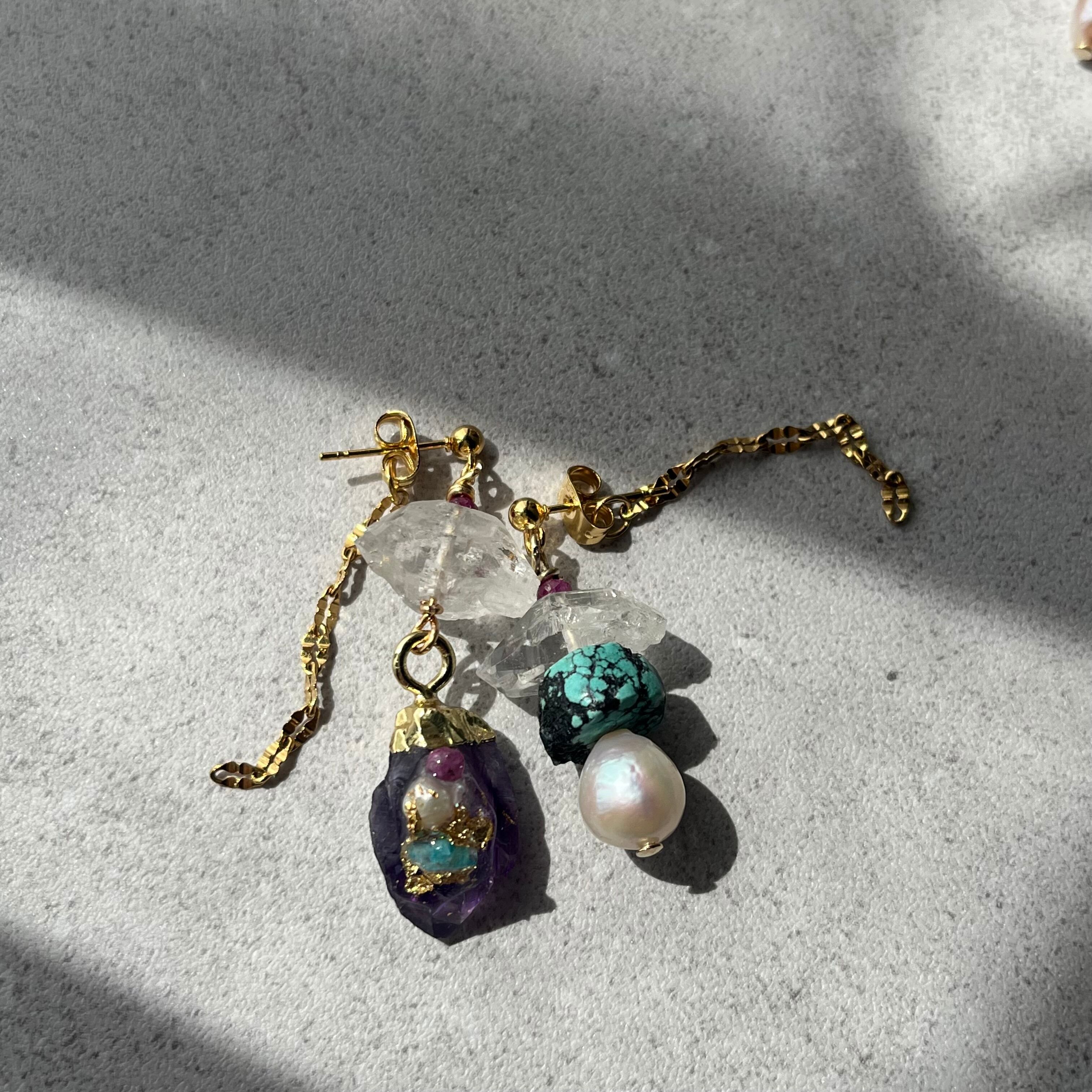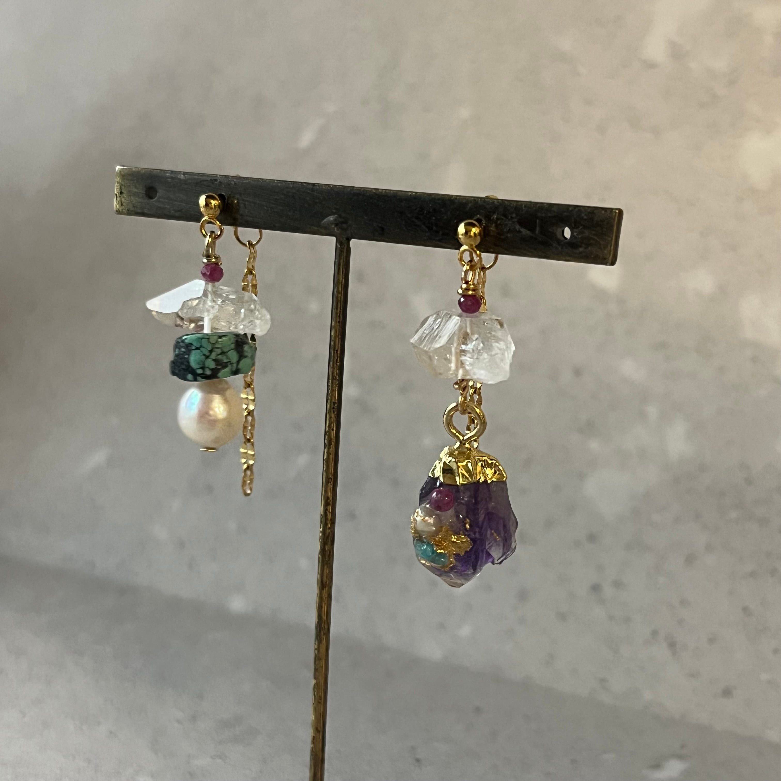 アメジストに天然石などを装飾し、ハーキマークォーツやターコイズ、パールなどを使いアシンメトリーに仕上げたアイテム。