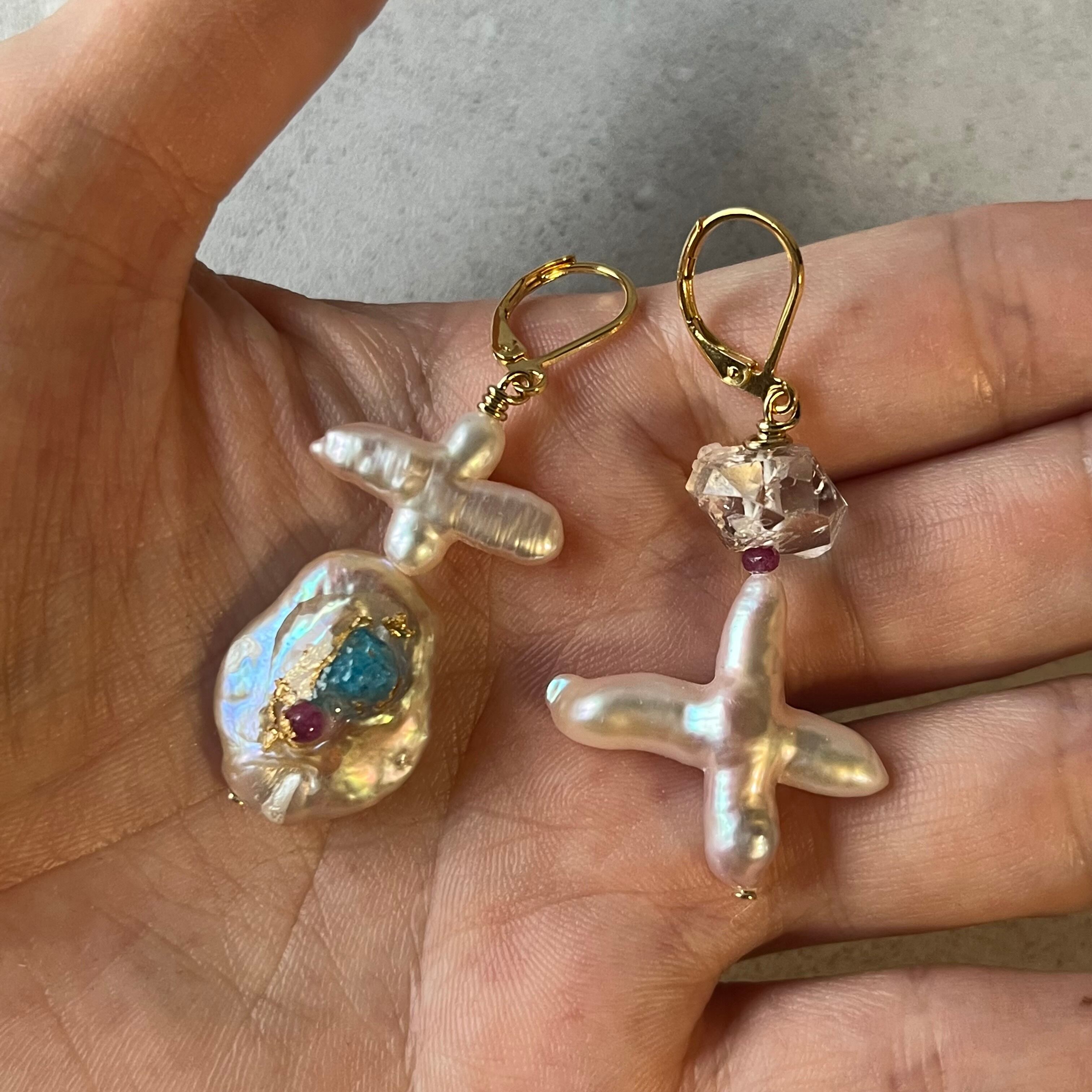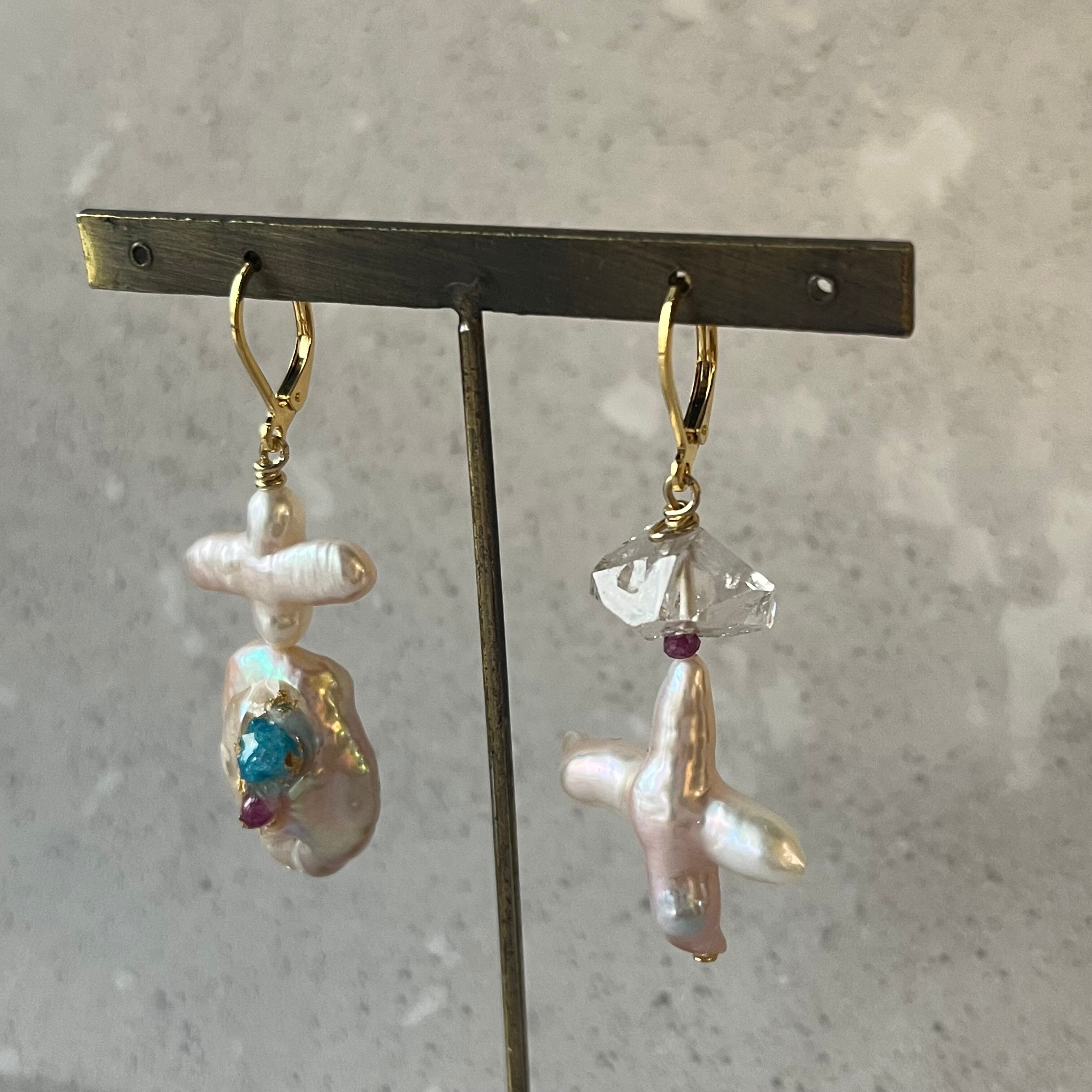 個性的な形の淡水パールに、天然石を張り合わせたアシンメトリーなピアス