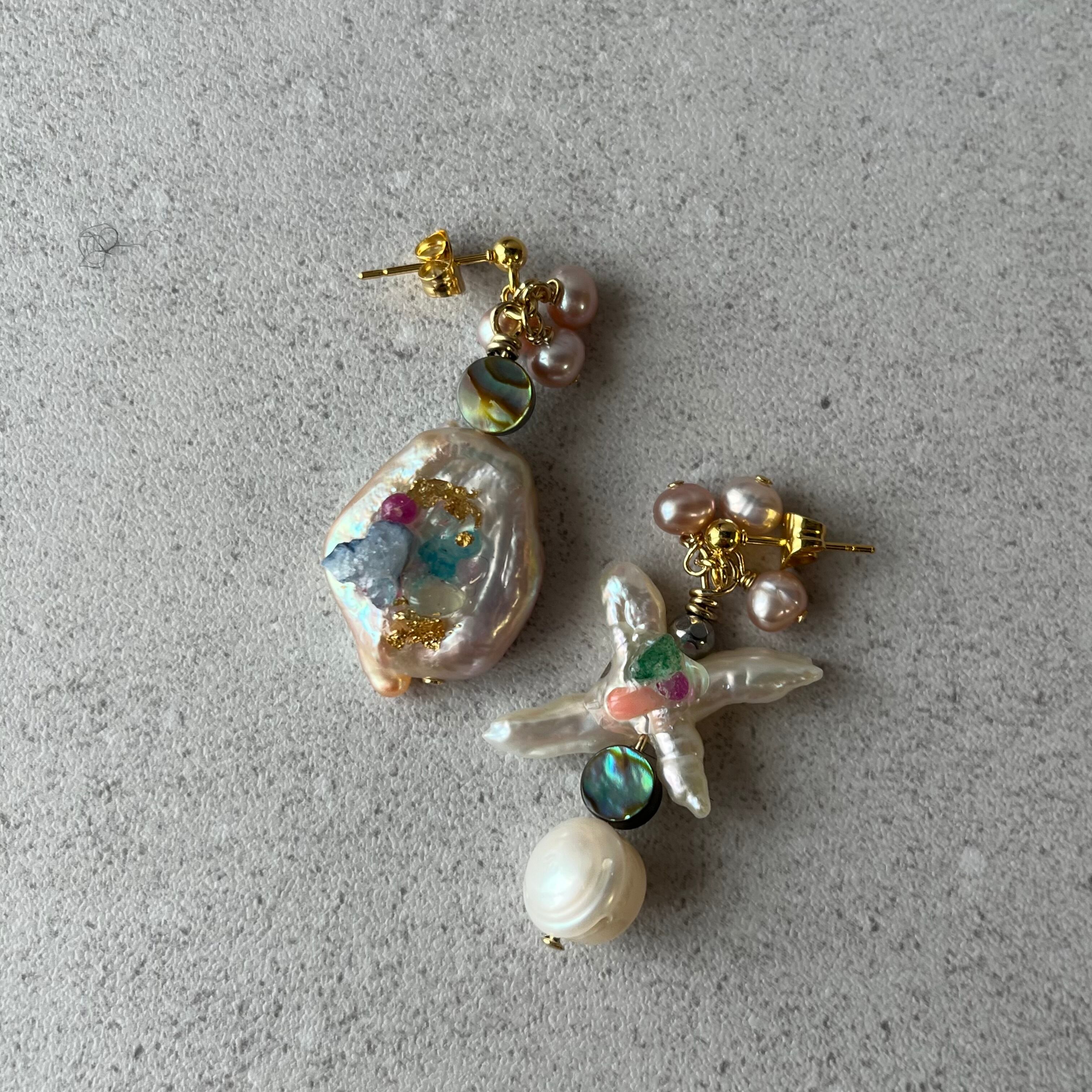 淡水パールに、天然石を張り合わせ、アバロンシェルやパールなどと組み合わせたデザイン。