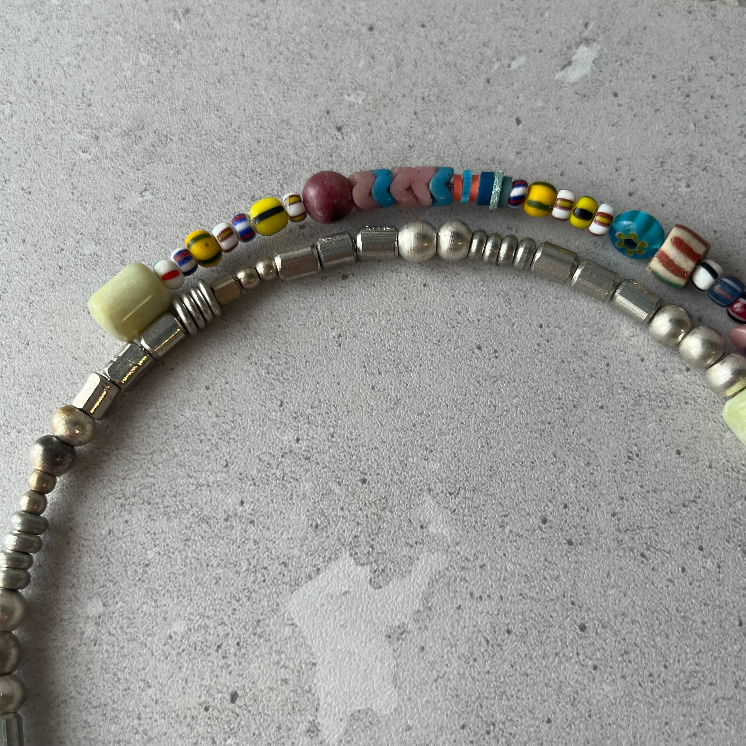 エキゾチックビーズとホワイトメタルビーズチョーカー(Pink&L.Blue mix×Silver)