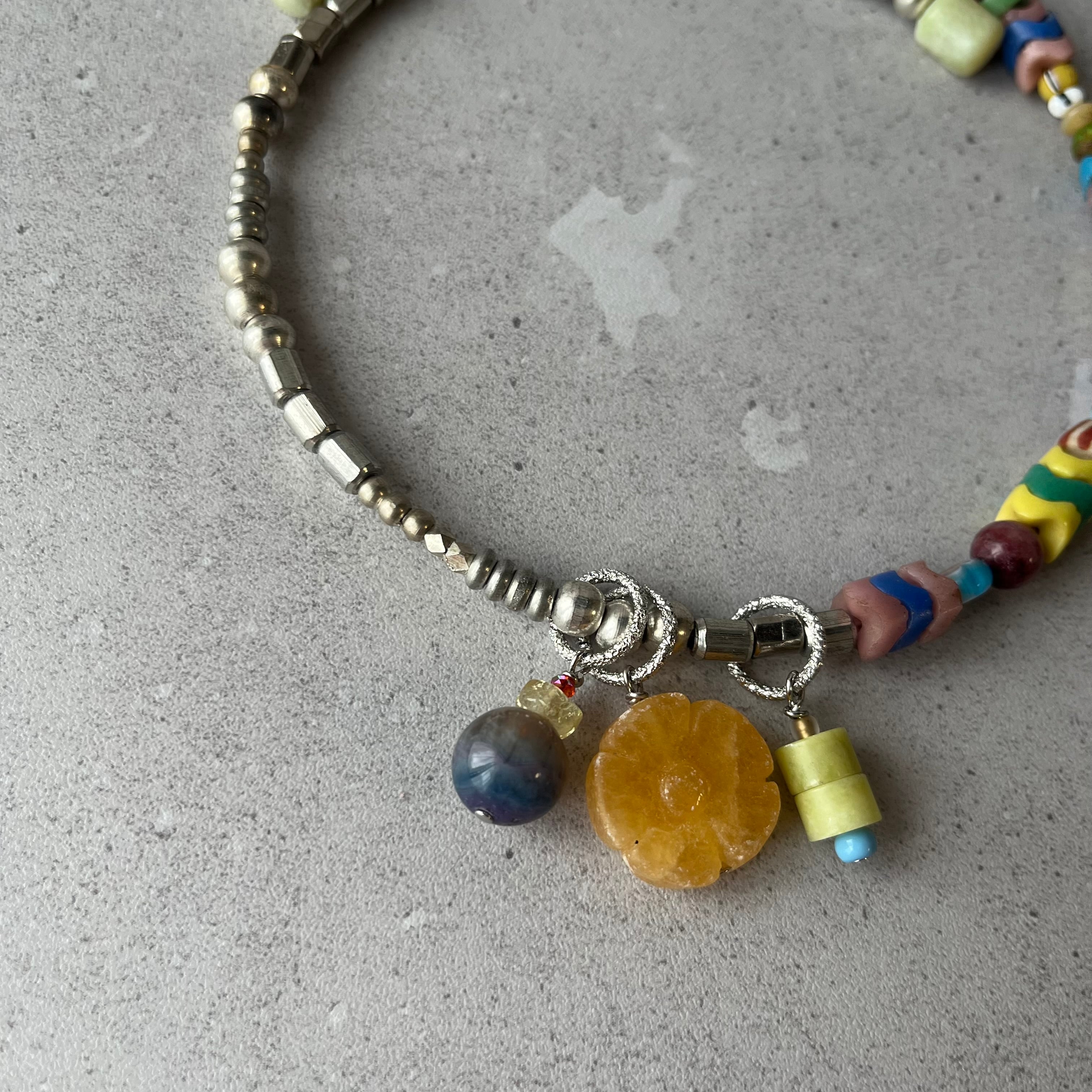 アンティークビーズや、エキゾチックな柄ビーズなどと、ホワイトメタルビーズを組み合わせたチョーカー。