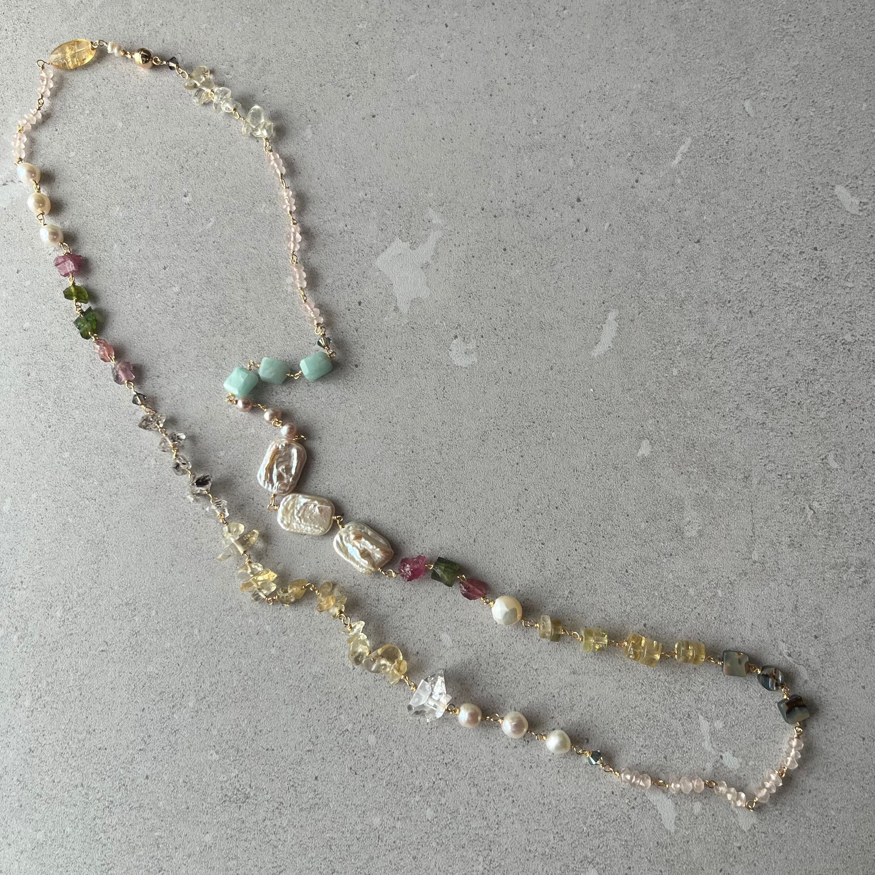 トルマリンや、ローズクォーツ、ハーキマークォーツ、シトリン、淡水パール、ラリマー、アバロンシェルなど、様々な素材を配置したロングネックレス。