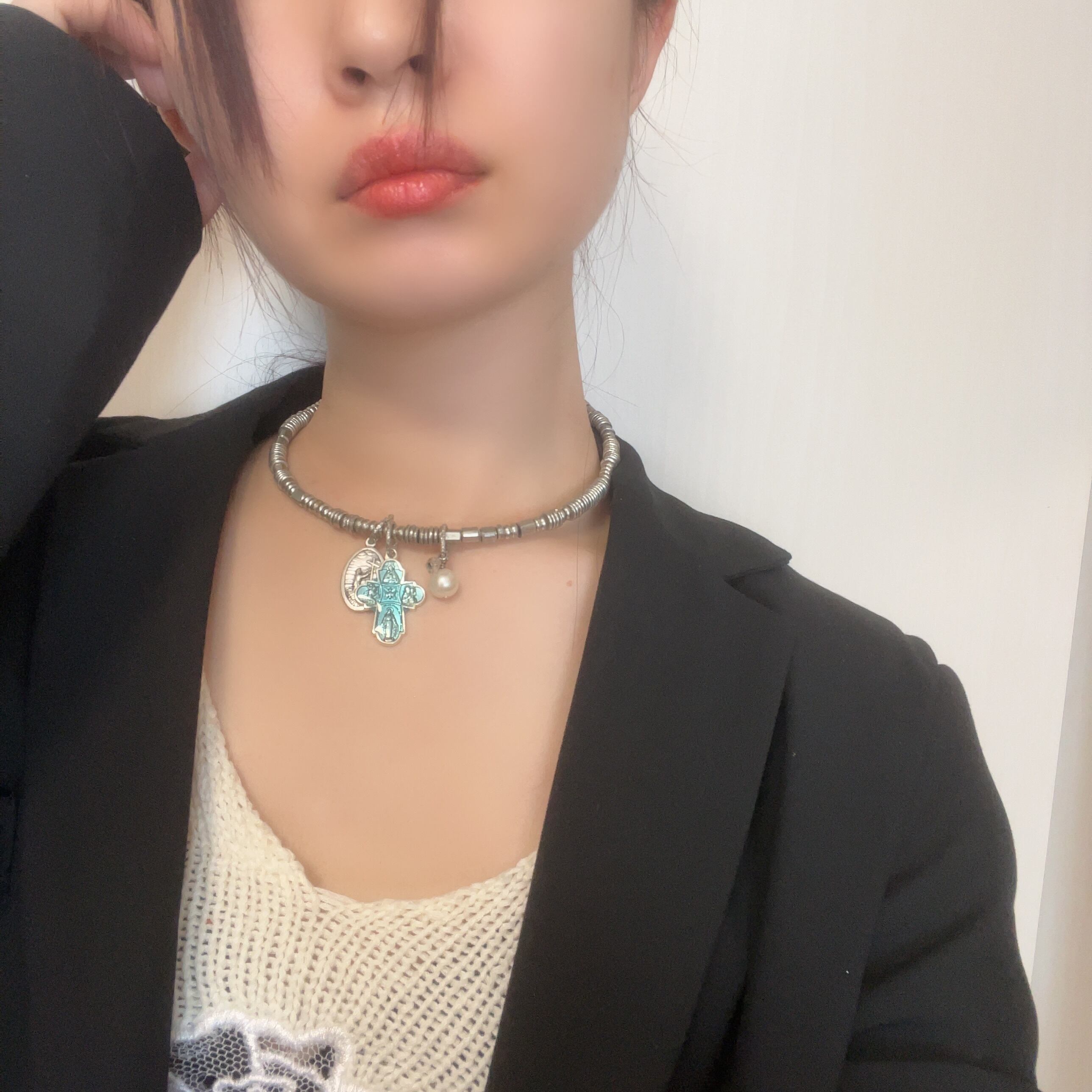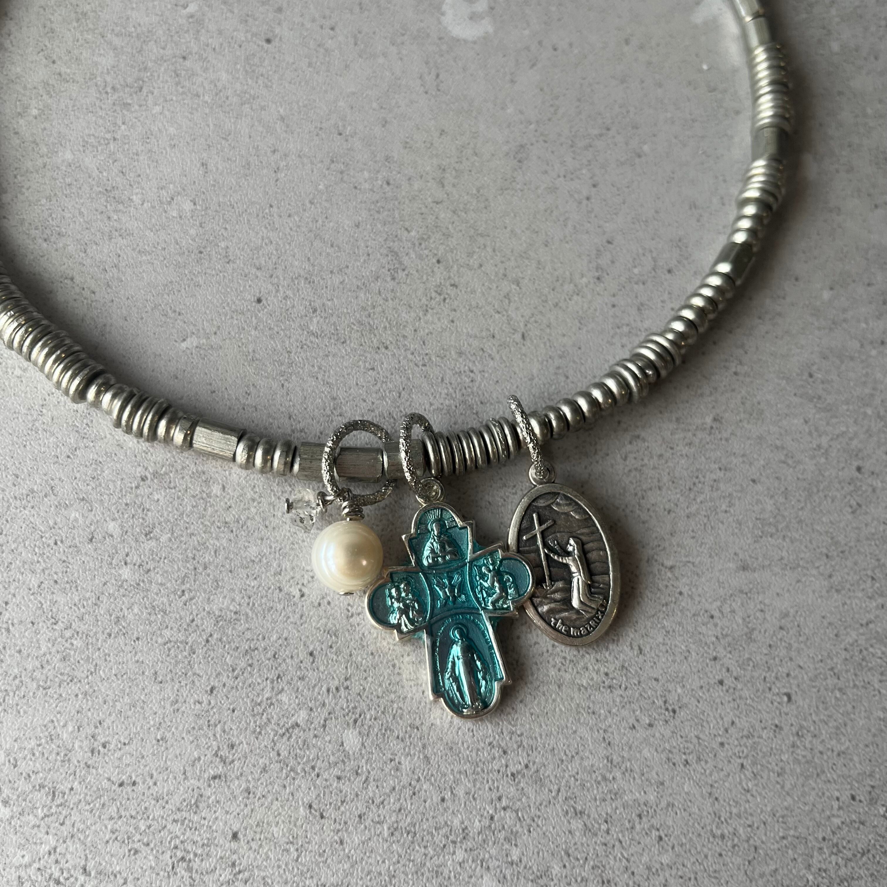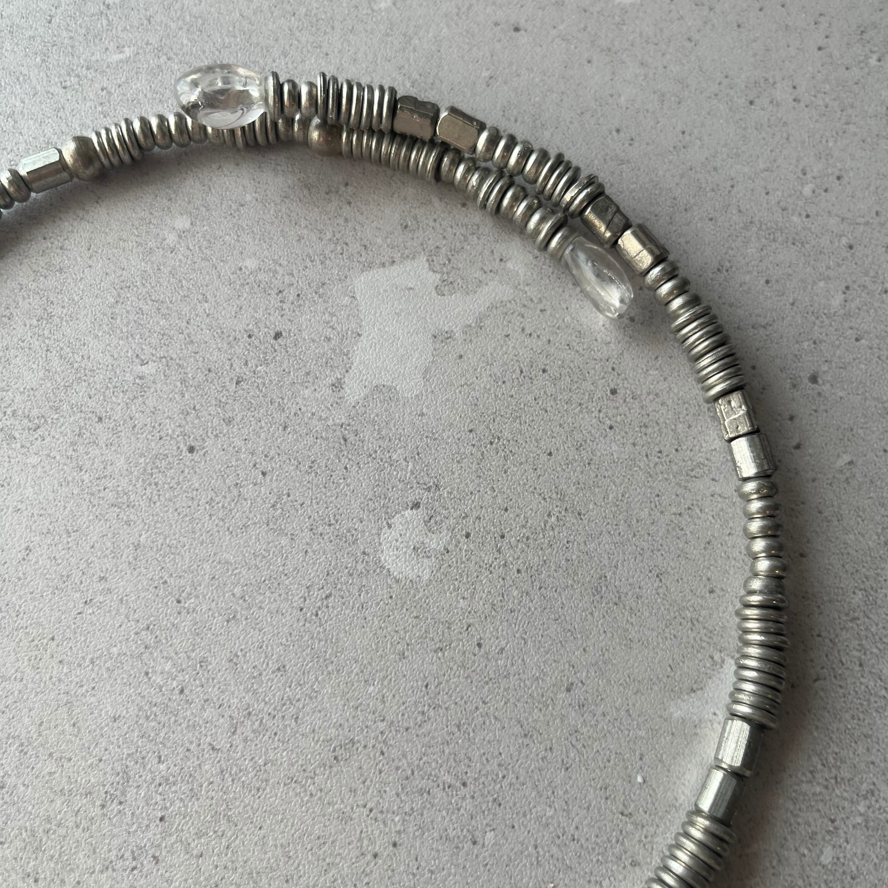 ホワイトメタルビーズや、水晶、メダイや淡水パールなどを組み合わせたチョーカー。