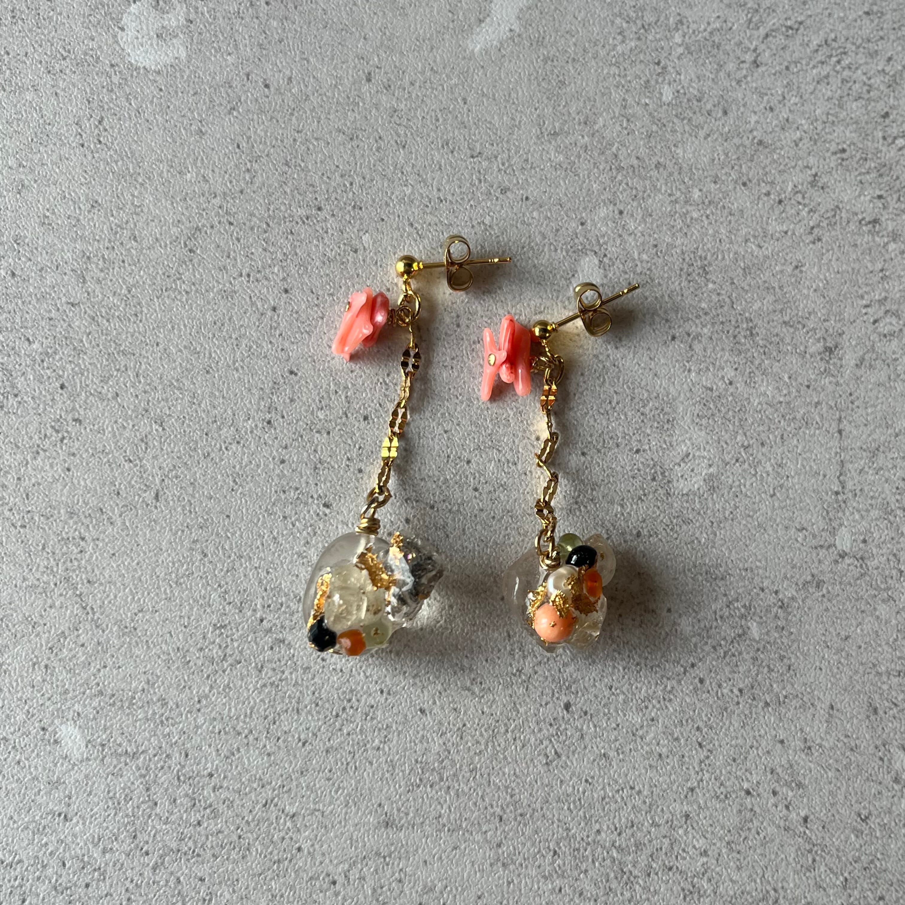 水晶とハーキマークォーツに天然石のカケラを装飾し、サンゴなどを使い石の形がちょっぴり違うアシンメトリーなデザインに仕上げたアイテム。