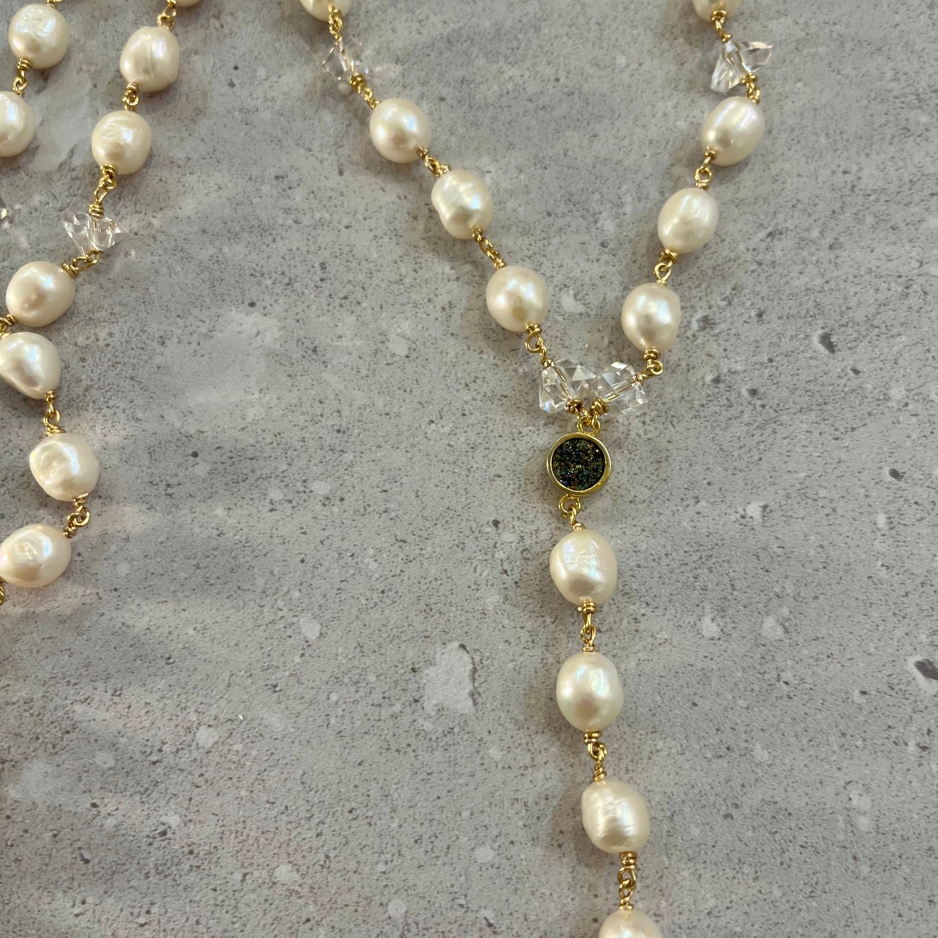 淡水パールを贅沢に使用し、天然石の微細な結晶「ドゥルージー」をアクセントにあしらった、ロザリオ調ネックレス。