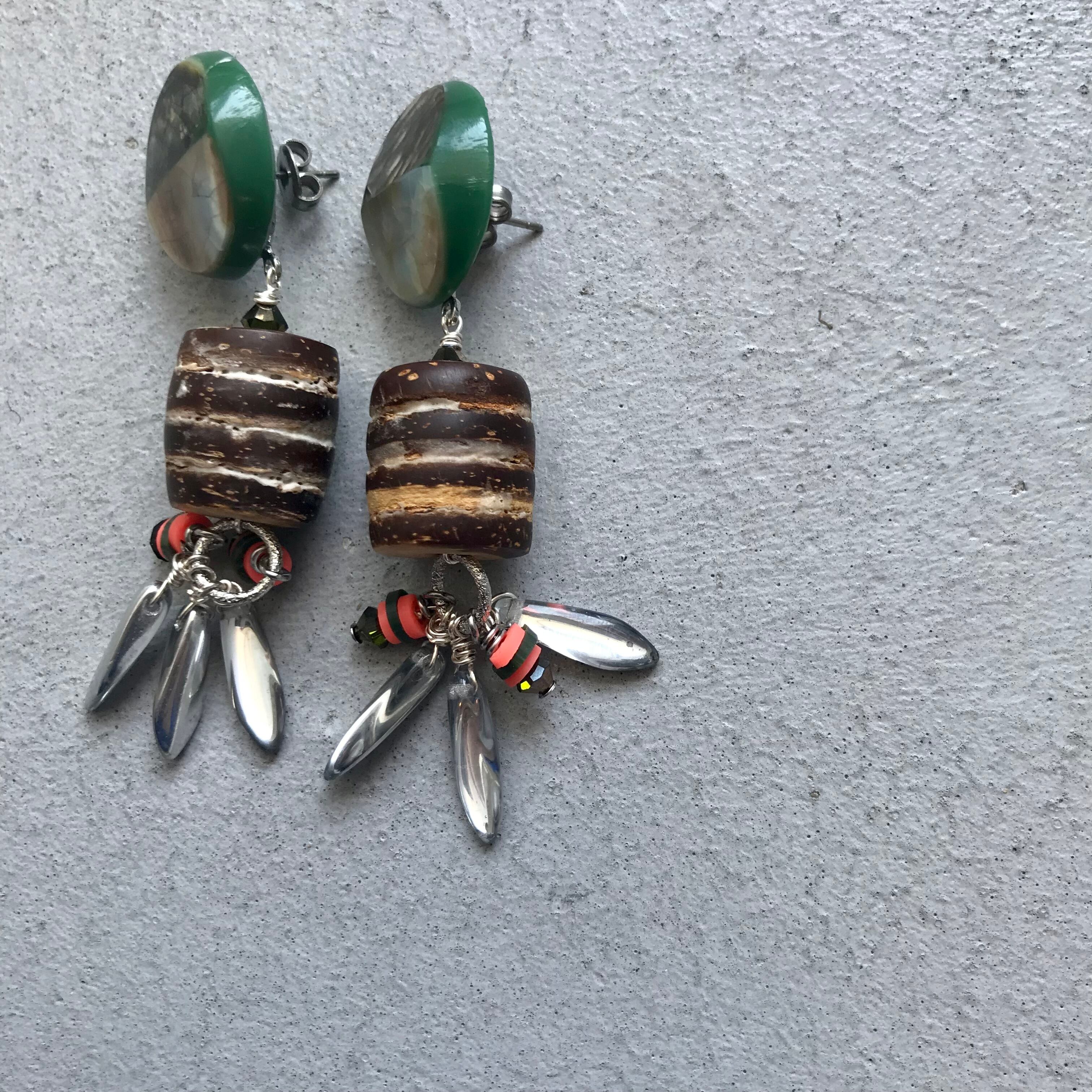 落ち着いた色味のシェルボタンとウッドビーズを組み合わせ、蛍光カラーをアクセントに使ったデザイン。
