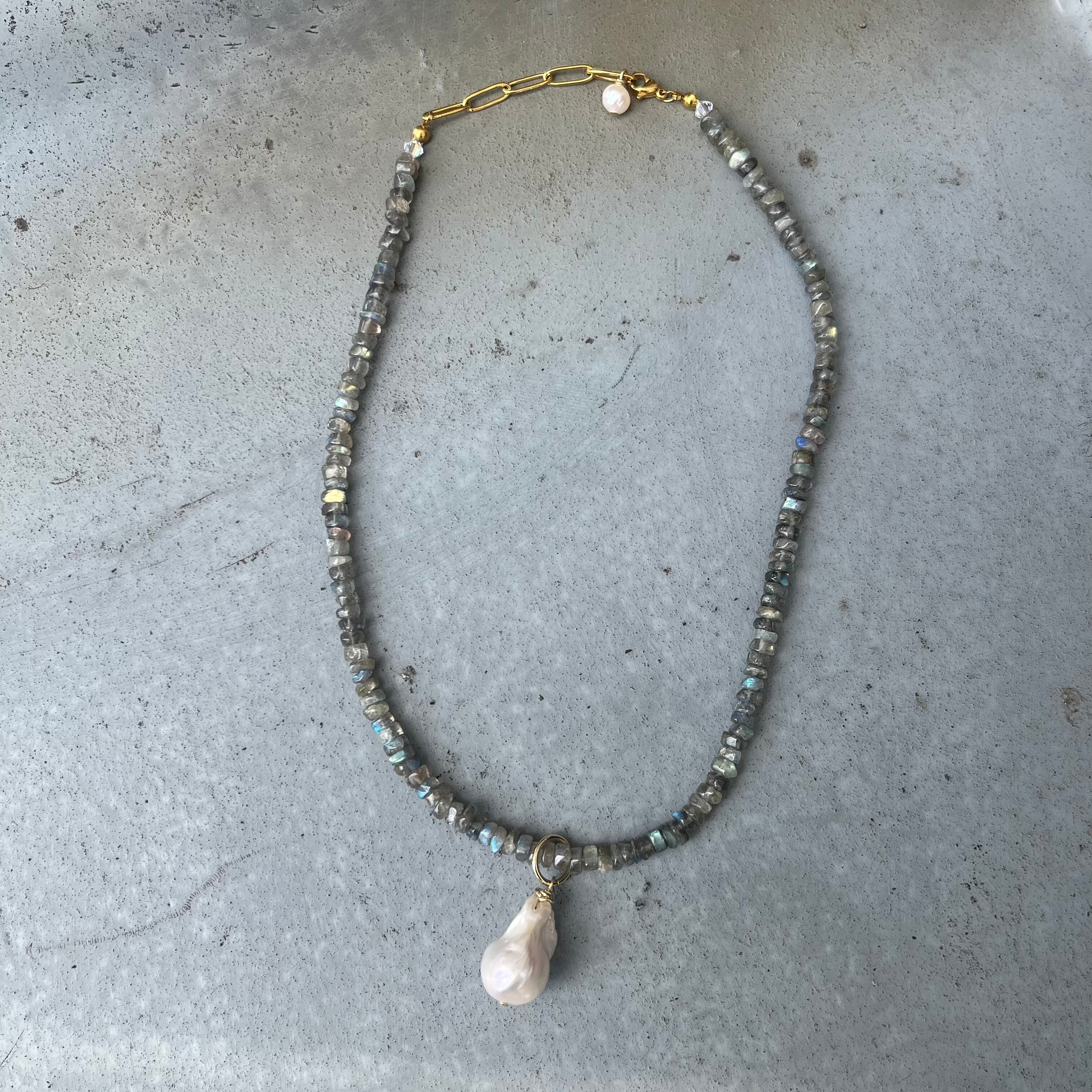 ネックレス部分にラブラドライト、トップに淡水パールを使ったネックレス