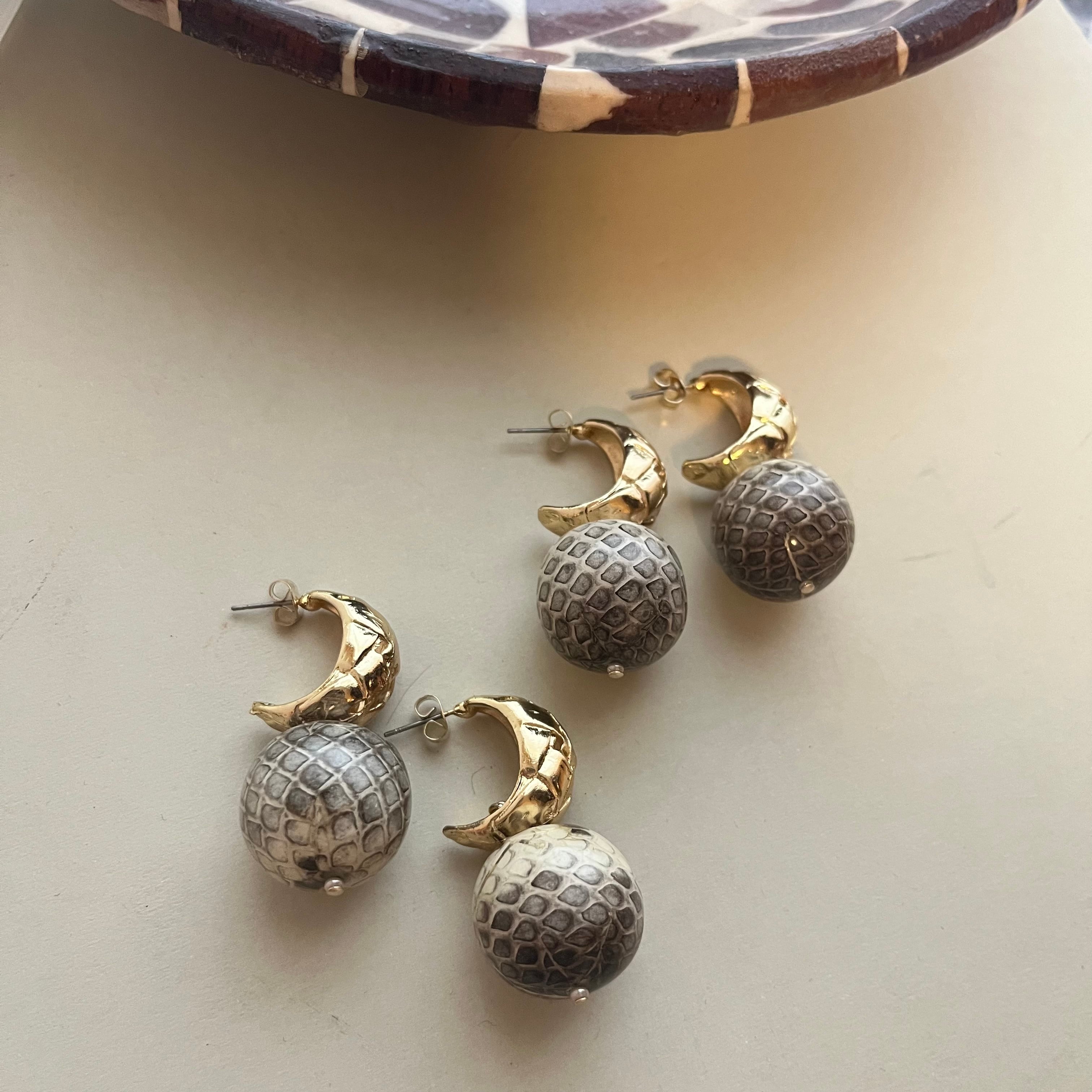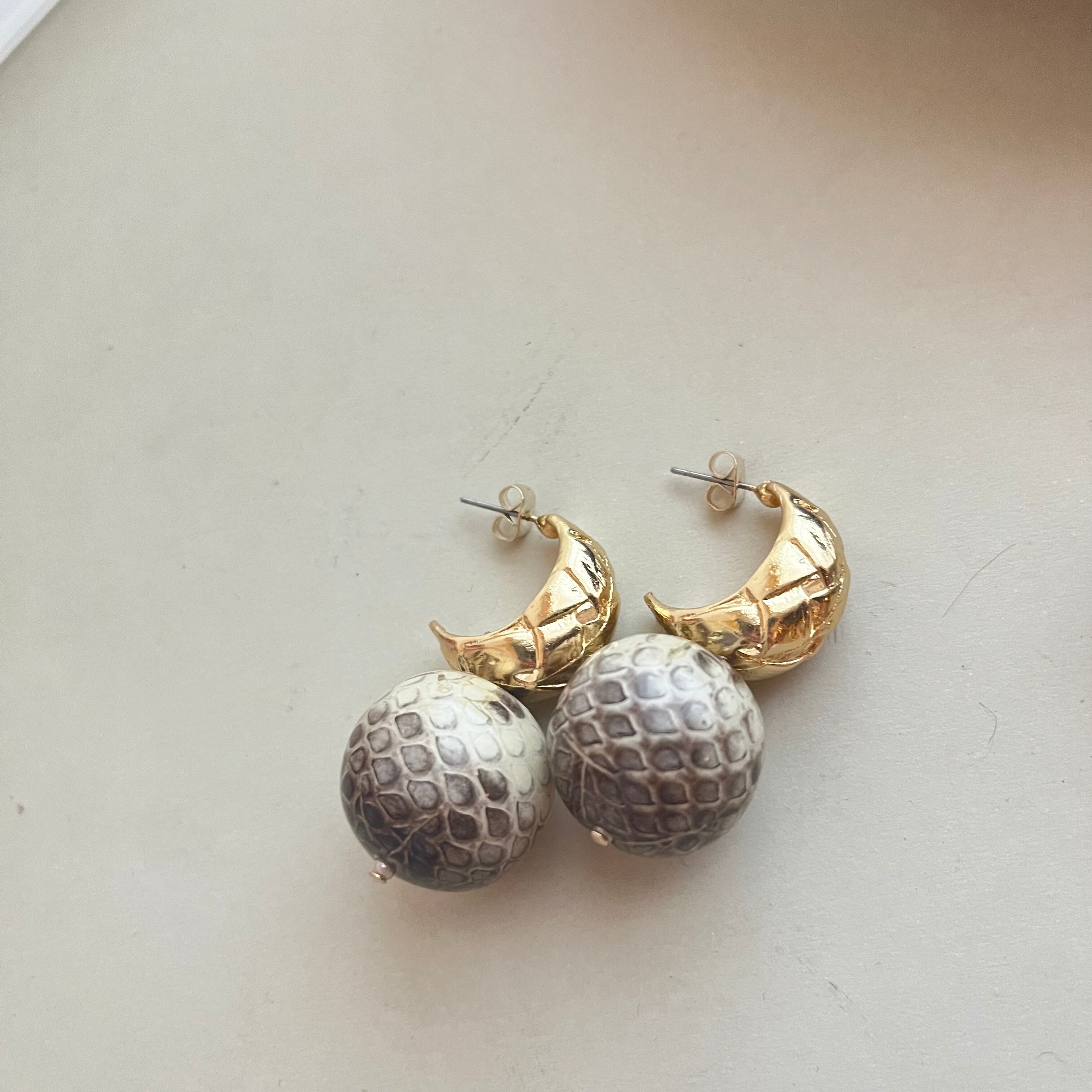 パイソン柄ビーズと三日月型の金具のデザインがかわいいアイテム。