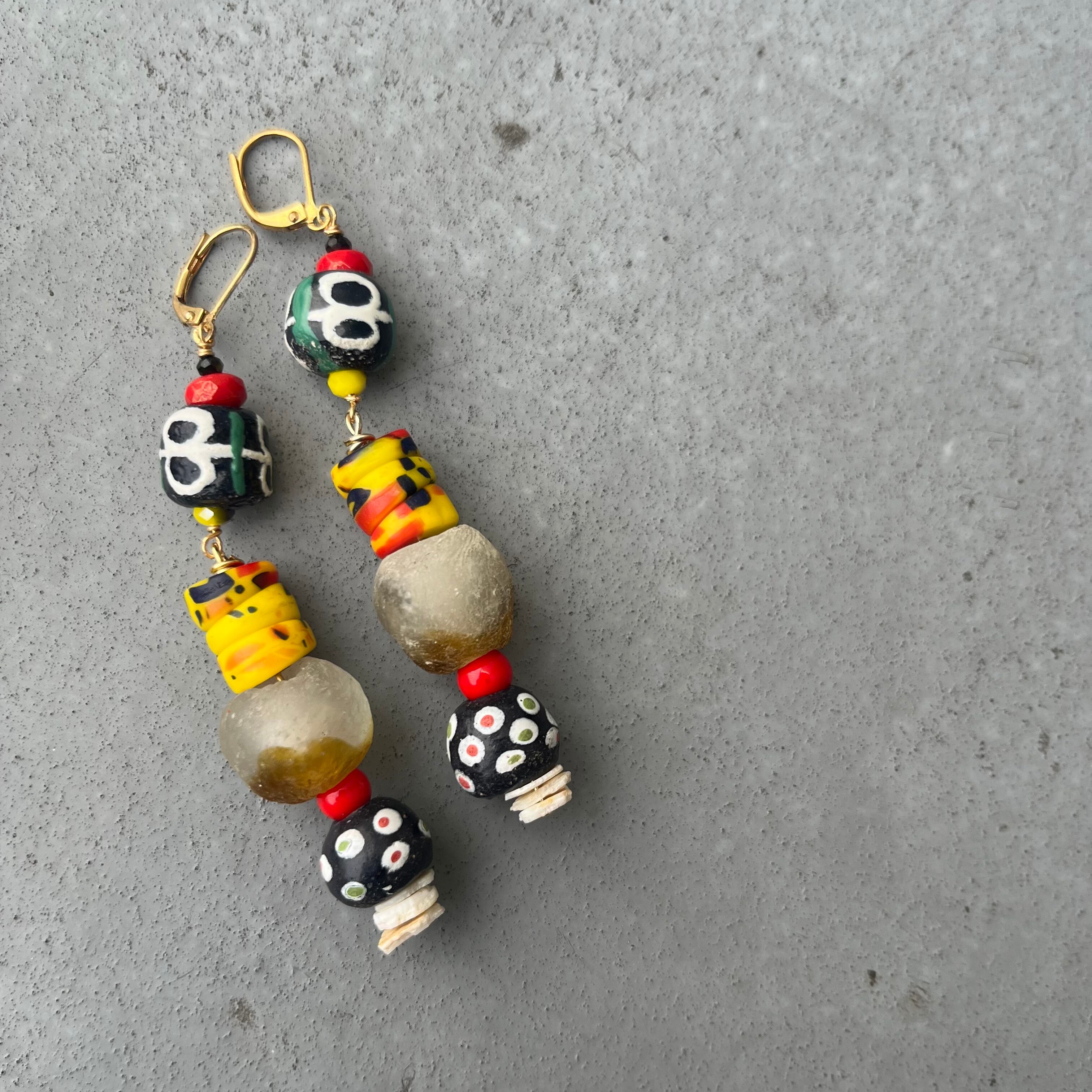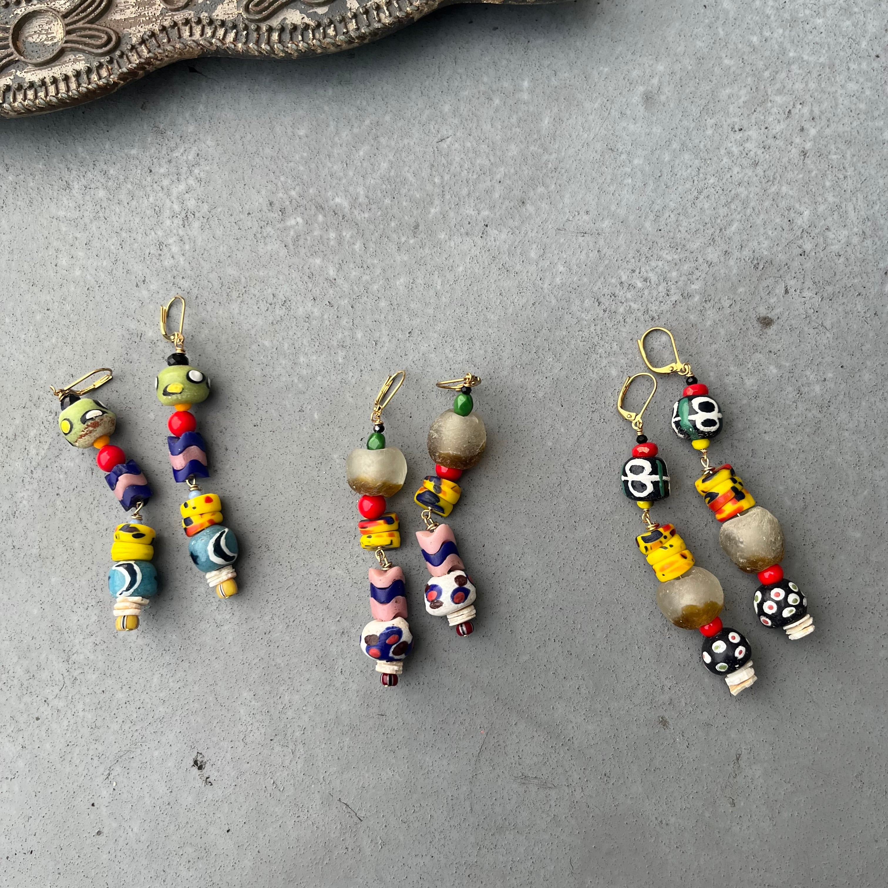 ヴィンテージガラスビーズやアンティークビーズなどを組み合わせたエキゾチックなデザインピアス