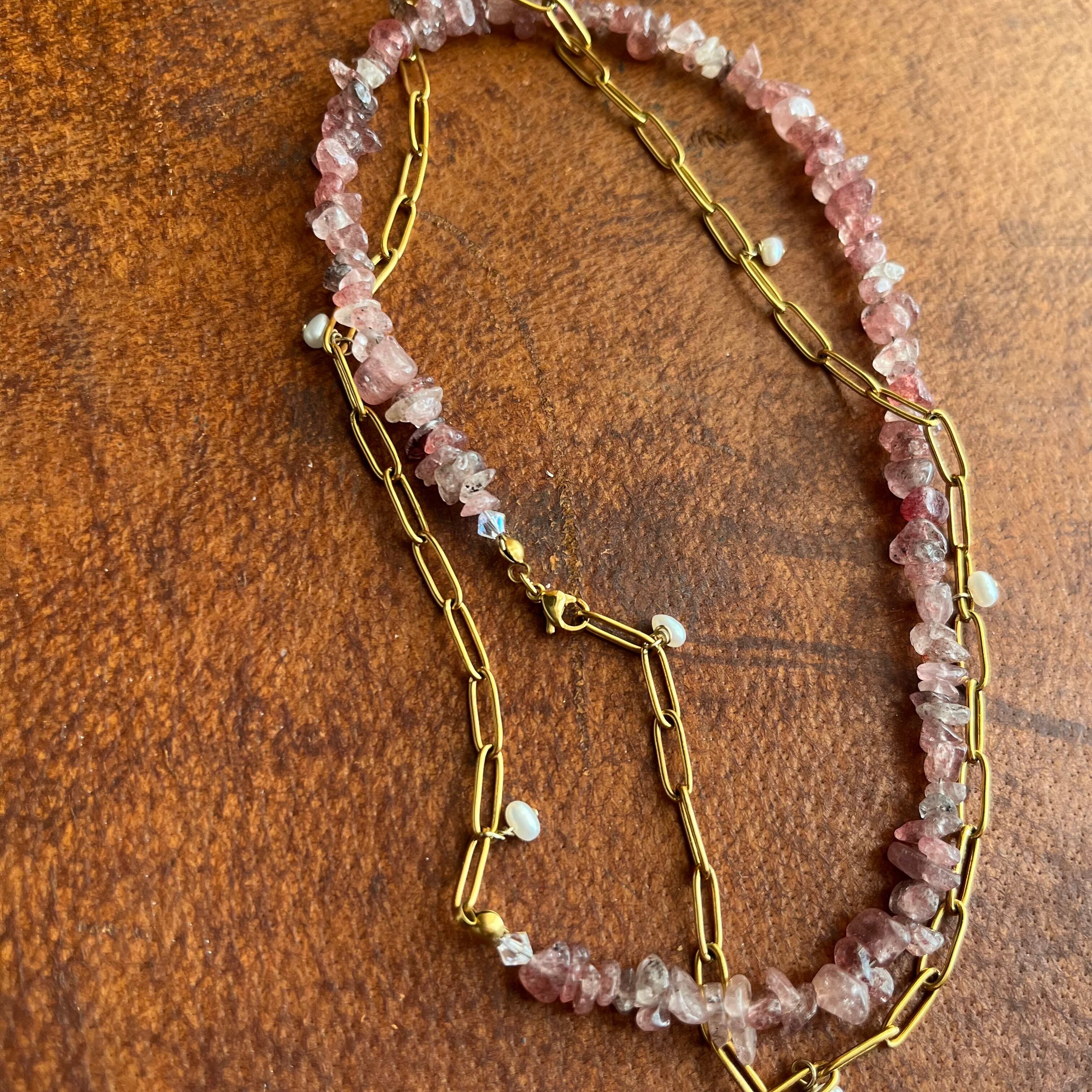 マンガンマイカクゥオーツ&チェーンとパールの3wayネックレス