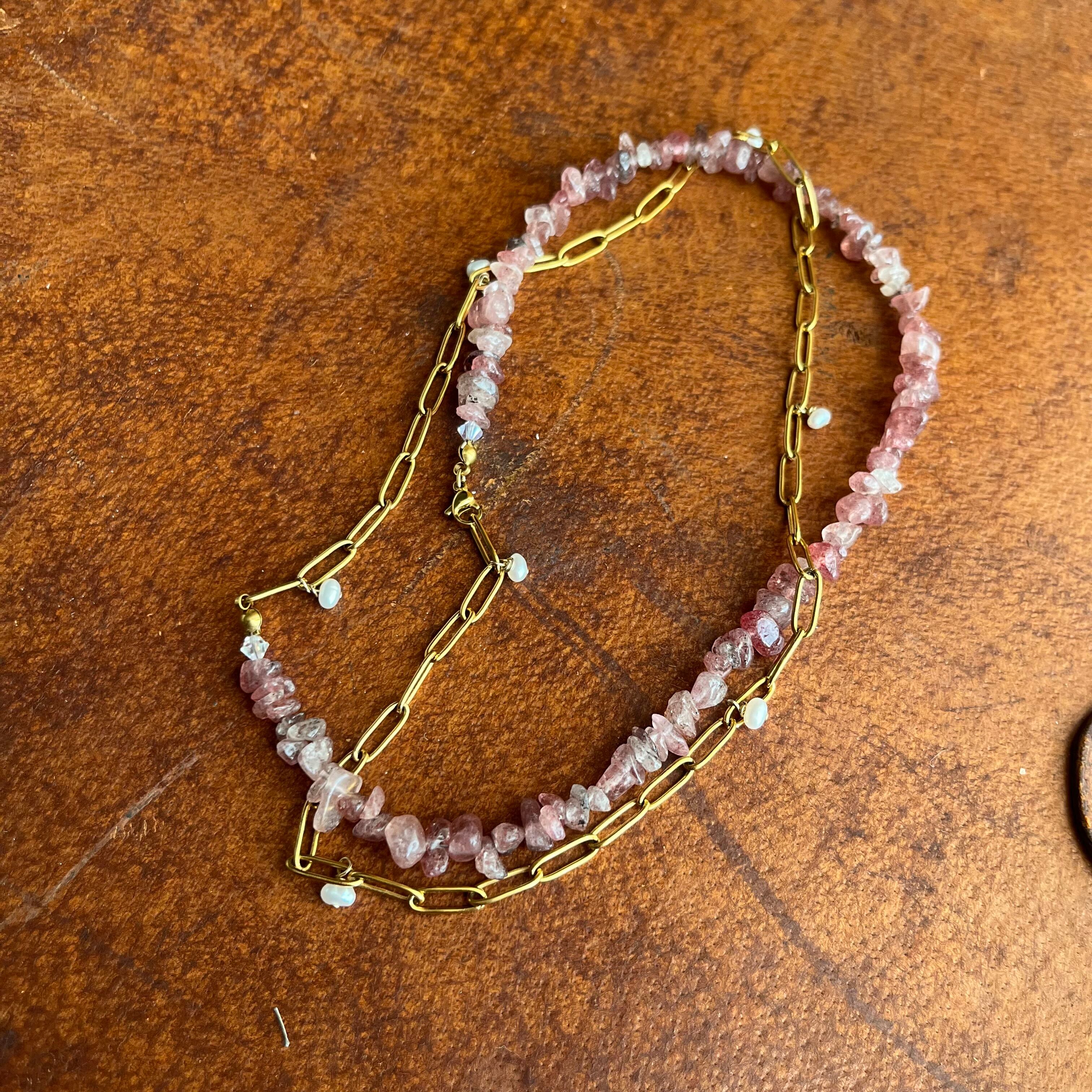 マンガンマイカクゥオーツと淡水パールと、チェーンを組み合わせた3wayネックレス。
